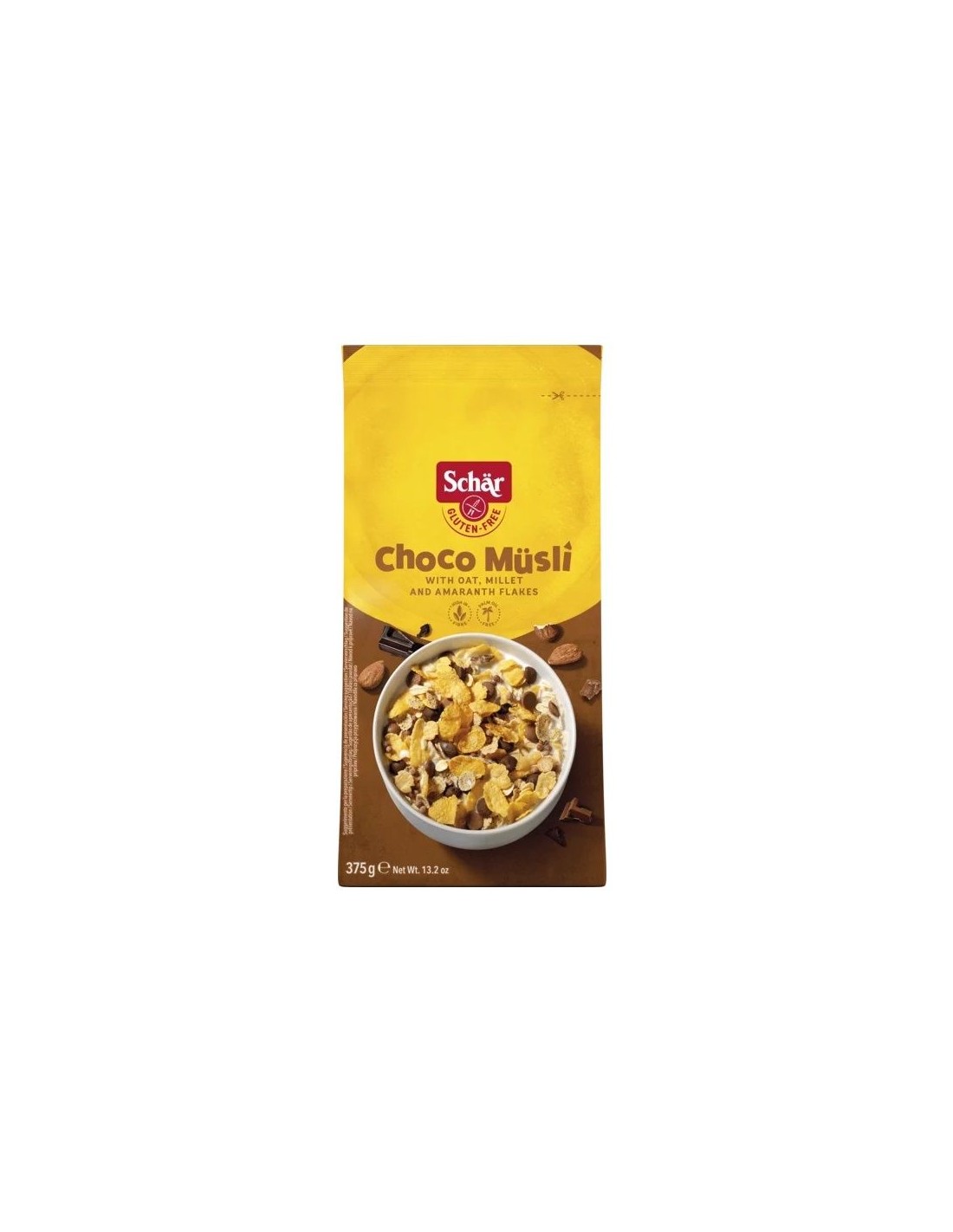 Ingredientes:Copos de avena sin gluten 25%, harina de maíz, copos de soja, chocolate con leche 10% (azúcar, manteca de cacao, leche entera en polvo, p