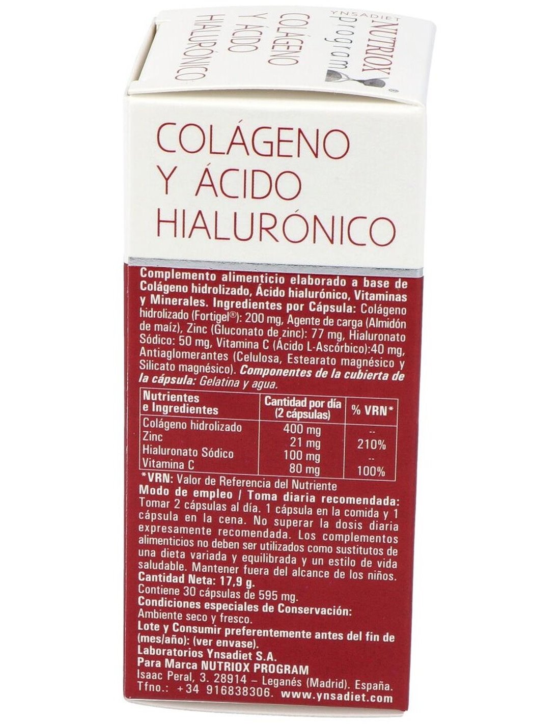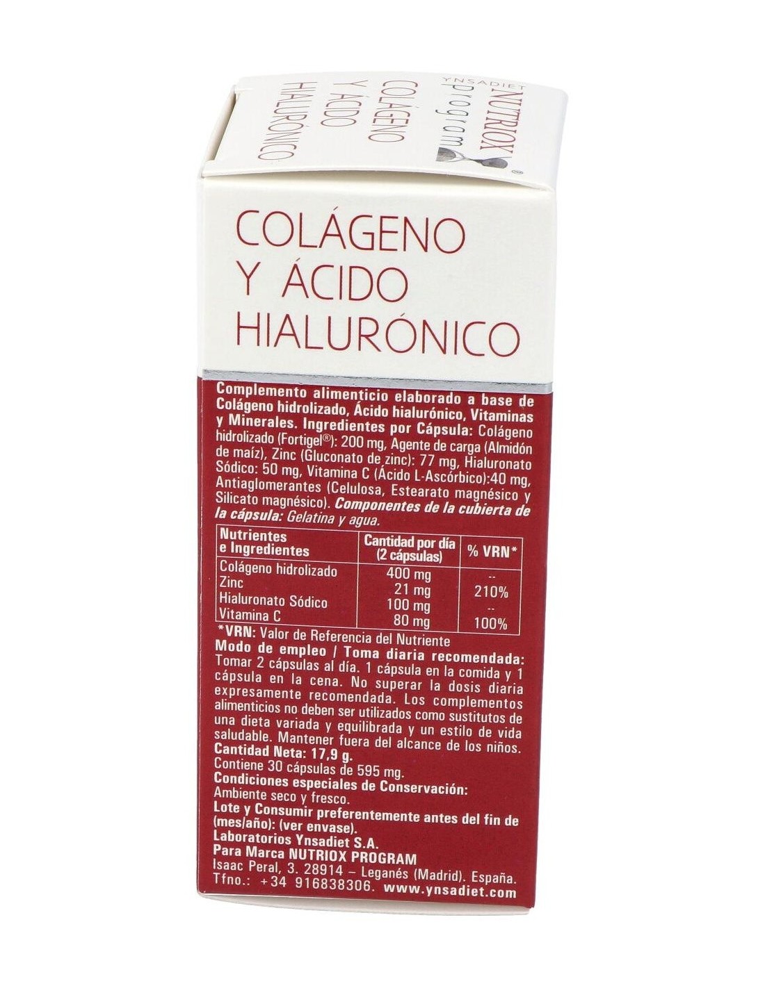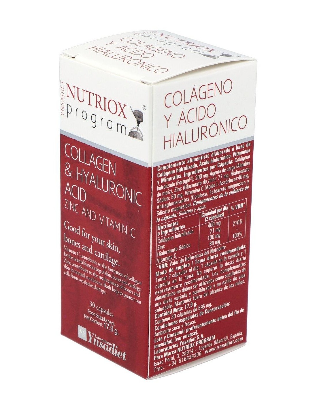Ynsadiet colágeno + ácido hialurónico Nutriox es un complemento alimenticio que combina colágeno y ácido hialurónico (junto a zinc y vitamina C, para mejorar su absorción) para favorecer el estado óptimo de la piel y contribuir a frenar el envejecimiento celular.