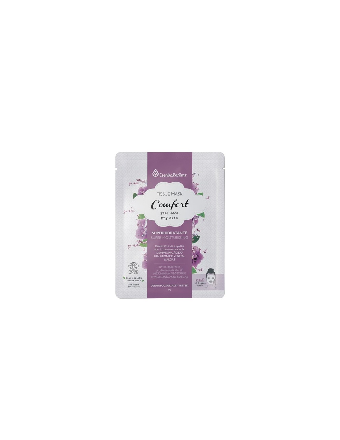 Tissue Mask Comfort de Esential'Aroms es una mascarilla de algodón especialmente recomendada para el alivio de las pieles secas.