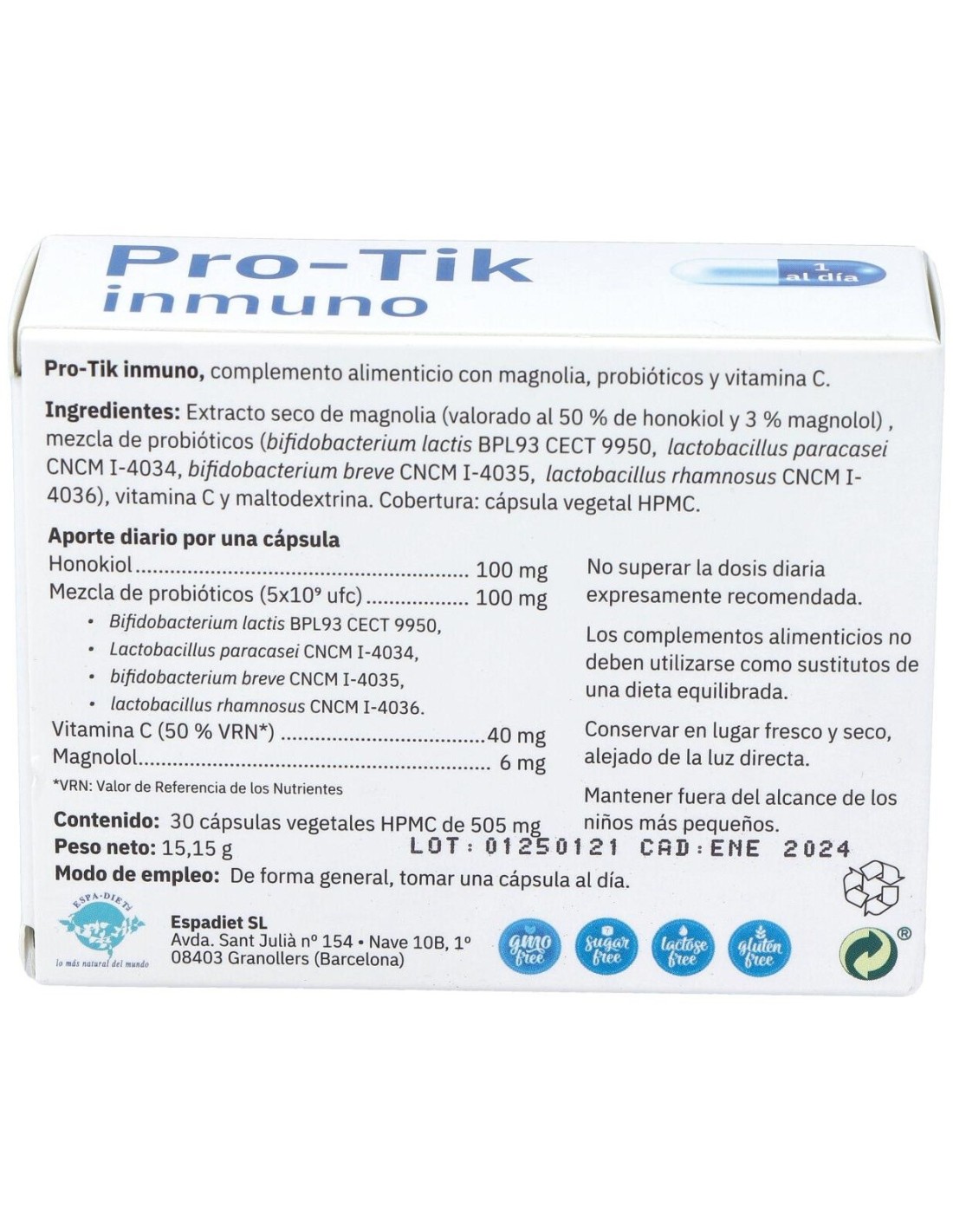 Extracto seco de magnolia (valorado al 50 % de honokiol y 3 % magnolol) , mezcla de probióticos (bifidobacterium lactis BPL93 CECT 9950, lactobacillus paracasei CNCM I- 4034, bifidobacterium breve CNCM I-4035, lactobacillus rhamnosus CNCM I-4036), vitamina C y maltodextrina. Cobertura: cápsula vegetal HPMC.