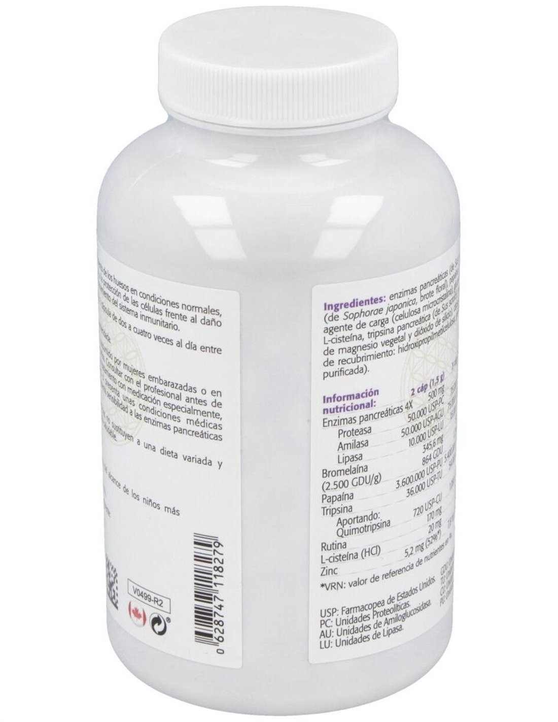 Enzimas pancreáticas (de Sus scrofa), bromelaína, rutina (de Sophorae japonica, brote floral), papaína (de Carica papaya, fruto), agente de carga (celulosa microcristalina), gluconato de zinc, clorhidrato de L-cisteína, tripsina pancreática (de Sus scrofa), antiaglomerantes (estearato de magnesio vegetal y dióxido de silicio), cápsula vegetal entérica (agente de recubrimiento: hidroxipropilmetilcelulosa: gelificante: goma gellan: agua purificada).