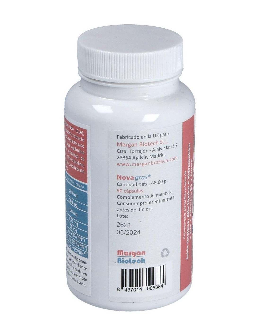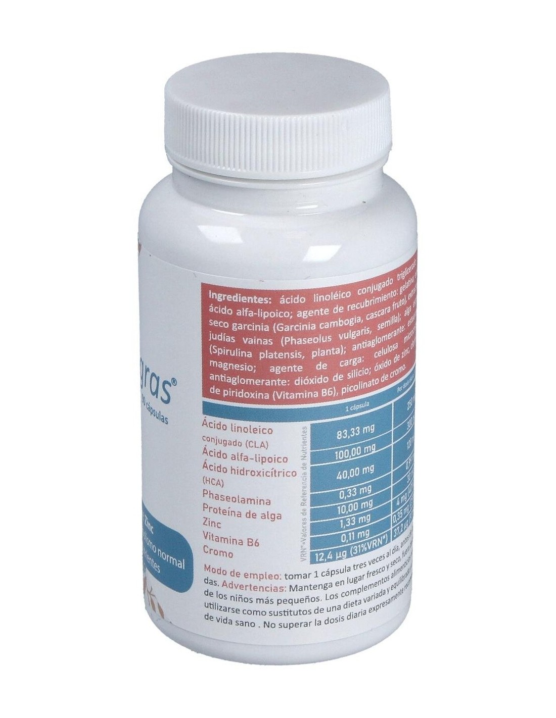 Ácido Linoléico conjugado triglicerado (CLA), ácido alfa-lipoico: agente de recubrimiento: gelatina: extracto seco garcinia (Garcinia cambogia, cascara fruto), extracto seco Judías vainas (Phaseolus vulgaris, semilla), alga espirulina (Spirulina platensis, planta), antiaglomerante. estearato de magnesio, agente de carga: celulosa microcistalina: antiaglomerante. dióxido de silicio: óxido de zinc, clorhidrato de piridoxina (Vitamina B6), picolinato de cromo.