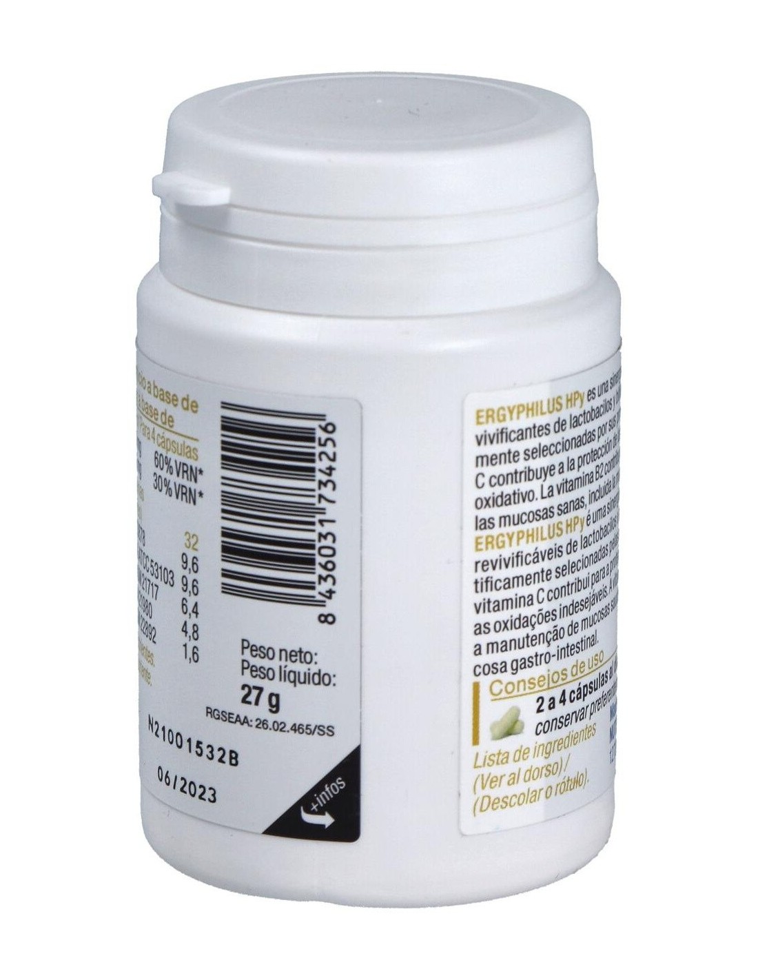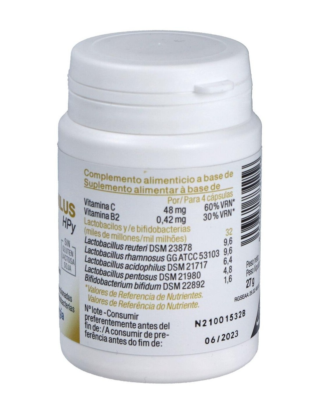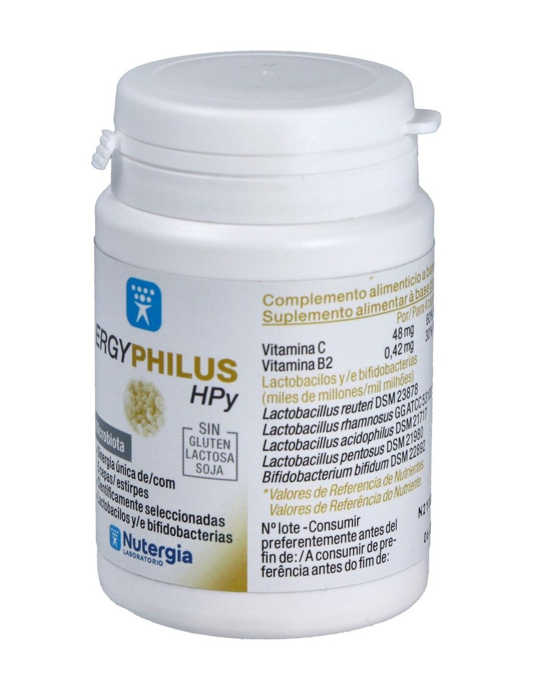 Sinergia única de 5 cepas de lactobacilos y bifidobacterias científicamente seleccionadas por sus propiedades: capacidad de revivificación, fuerte resistencia a la acidez gástrica, adhesión a la mucosa gástrica, inhibición de patógenos implicados en la disbiosis gástrica. Contiene vitamina B2, que favorece la salud de la mucosa gastrointestinal, y vitamina C por su protección antioxidante.