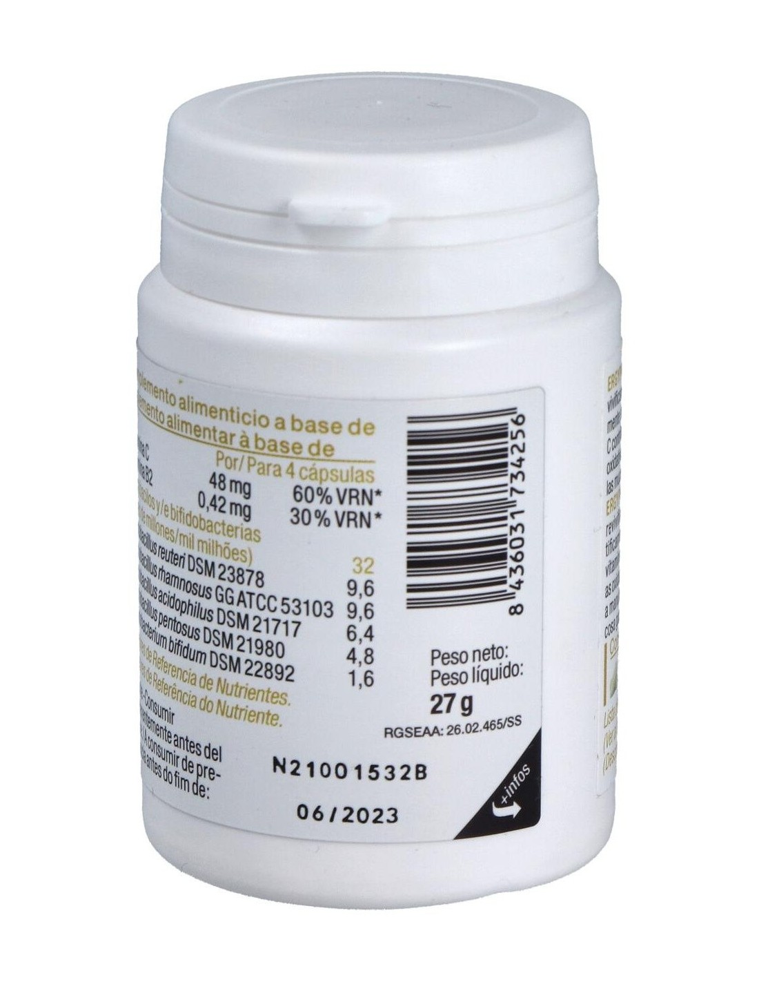 Almidón de patata, fructo oligosacáridos (FOS), lactobacilos y bifidobacterias liofilizadas, vitamina C (ácido L-ascórbico), antiaglomerante: estearato de magnesio vegetal: vitamina B2 (riboflavina). Cápsula: gelatina de pescado.