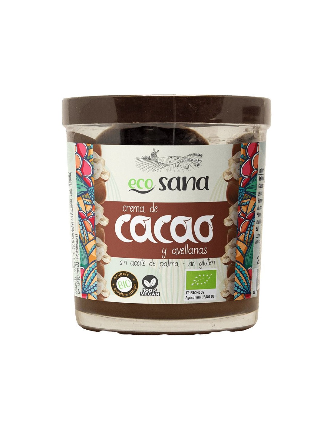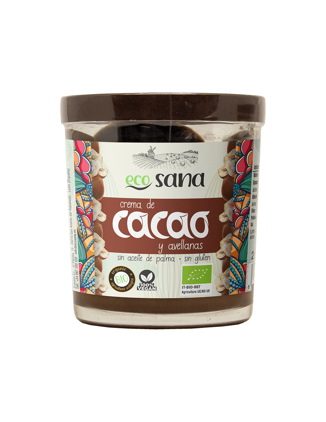 Ingredientes:Azúcar moreno*, Avellanas (14%), aceite de girasol*, cacao en polvo desgrasado* (7,5%), Harina de soja*, mantequilla de cacao*, Emulsiona
