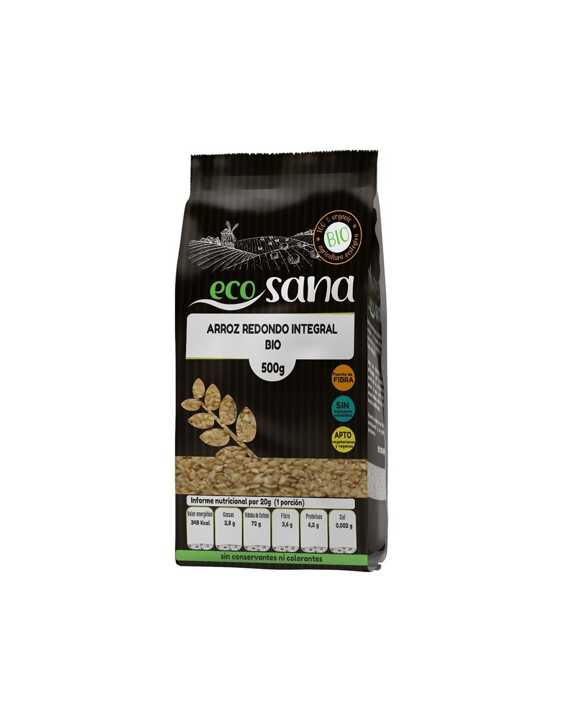 Ingredientes:Arroz redondo integral*. (*) Procedente de agricultura ecológica.Valor nutricional por 100 gramos:
