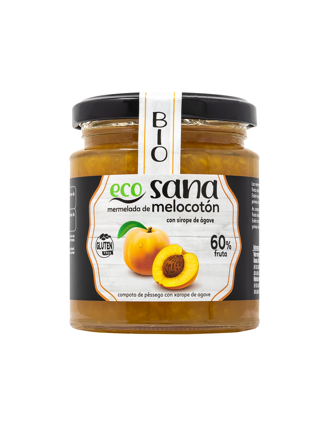 Ingredientes:Melocotón* (60%), Sirope de ágave*, Pectina de frutas, zumo de limón*. (*) Procedente de agricultura ecológica.Valor nutricional por 100 gramos: