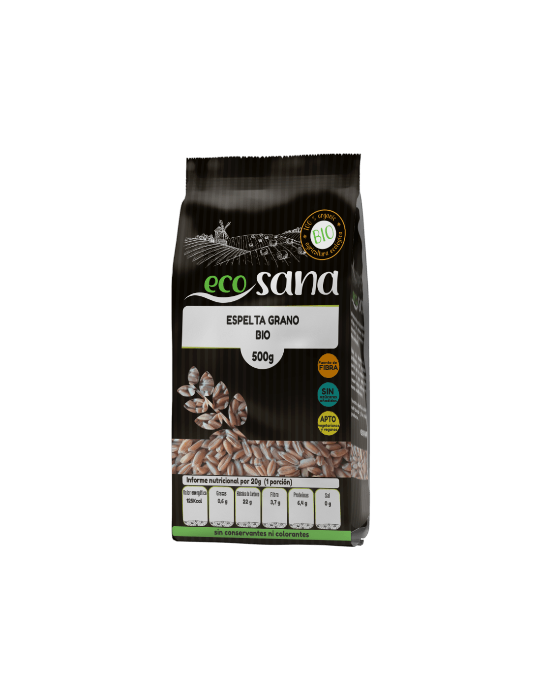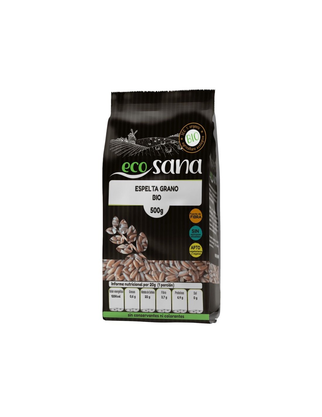 Ingredientes:Espelta en grano*. (*) Procedente de agricultura ecológica.Valor nutricional por 100 gramos: