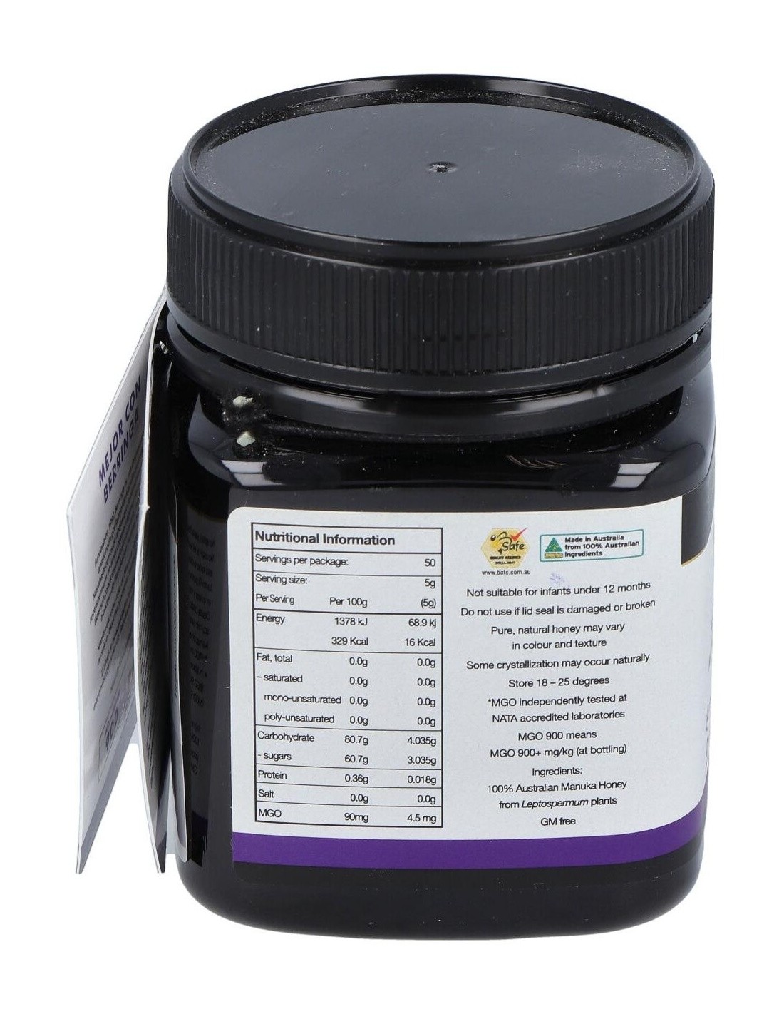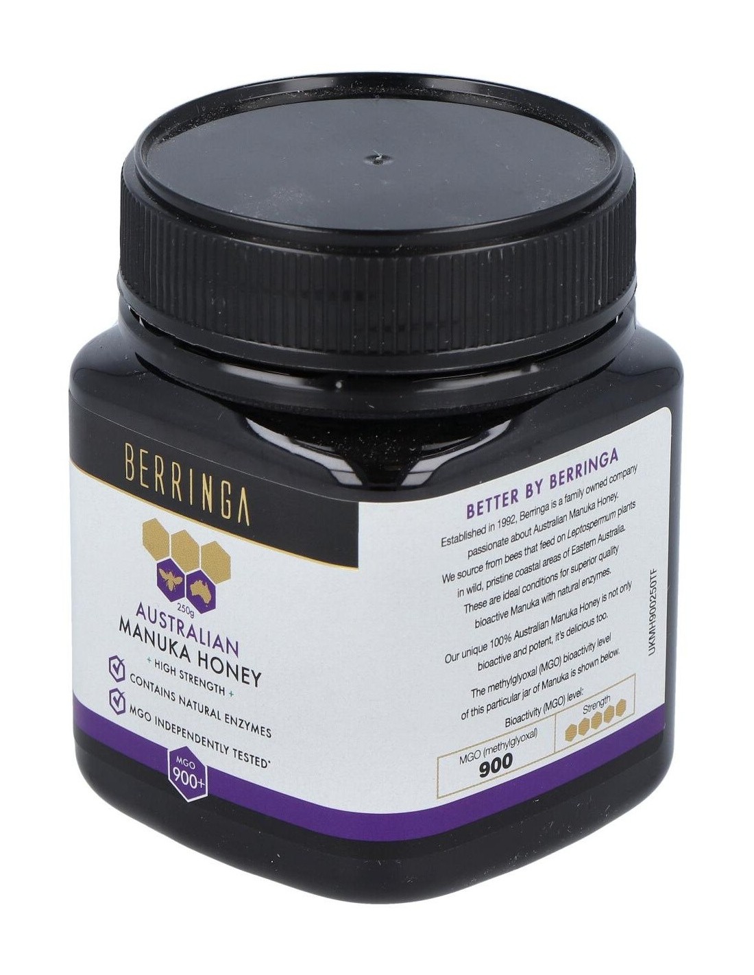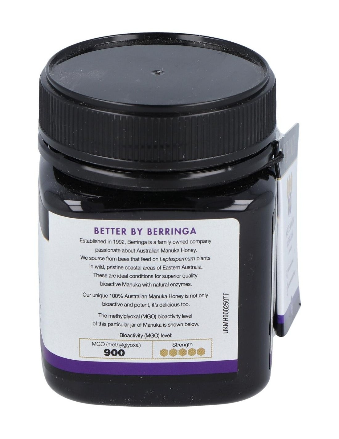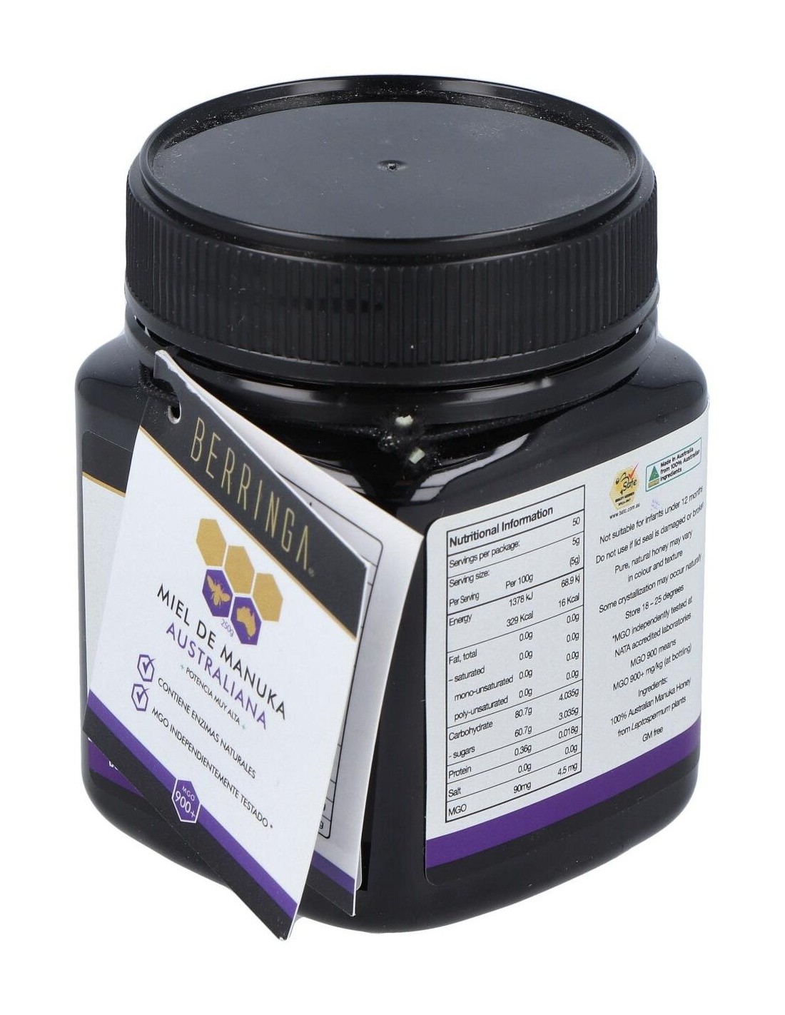 - Contiene 900 MGO (metilglioxal), un compuesto que contribuye a su perfil distintivo y a sus propiedades naturales.