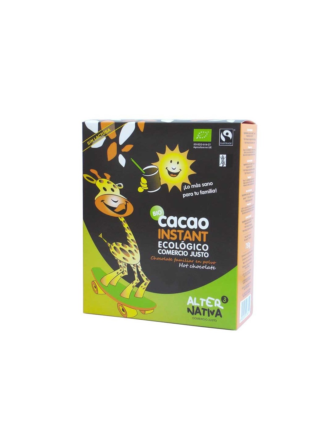 CACAO INSTANTANEO BIO 750G ALTERNATIVA3Exquisito cacao instantáneo ecológico. Sus ingredientes han sido cultivados en armonía con la Naturaleza, utilizando técnicas tradicionales, sin agroquímicos. De disolución inmediata tanto en leche fría como caliente.Cacao de variedad Criollo. El Criollo es la variedad de cacao más apreciada por su calidad, aroma y sabor. Se trata de un cacao muy aromático y menos amargo que el Forastero, que es la variedad más abundante.Se calcula que el cacao Criollo representa menos de un 3% de la producción mundial de cacao, debido a que la planta es muy delicada, y menos productiva que otras variedades.Sin lactosa ni gluten.Ingredientes:Azúcar de caña*, cacao desgrasado en polvo.**Procedente de Agricultura ecológica y Comercio Justo(Min. 35% Cacao Puro desgrasado.)Procedencia:Cacao de República Dominicana/Perú y Azúcar de ParaguayInformacion nutricional:Valor energético359kcalGrasas2,7 gCarbohidratos:75,2 gProteinas5,2 gSobre Alternativa 3:Alternativa 3, importa, elabora y distribuye productos ecológicos de comercio justo que han sido producidos respetando los derechos humanos, el medio ambiente y la justicia social.Miembro de WFTO (World Fair Trade Organization).Miembro de CECJ (Coordinadora Estatal de Comercio Justo).