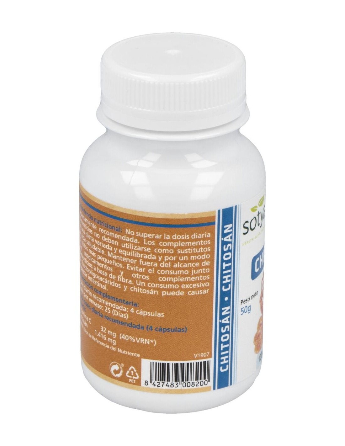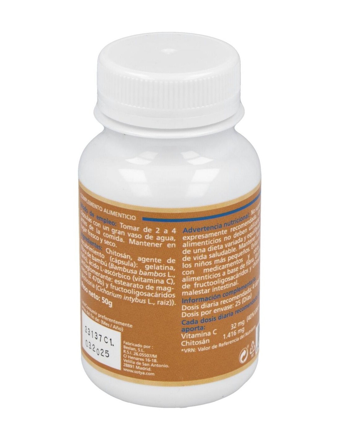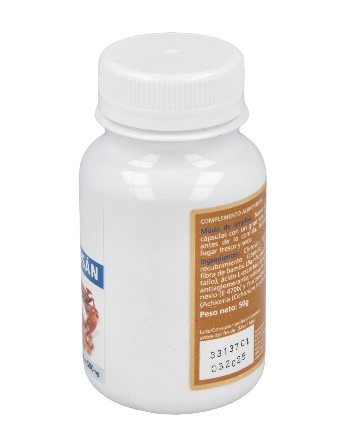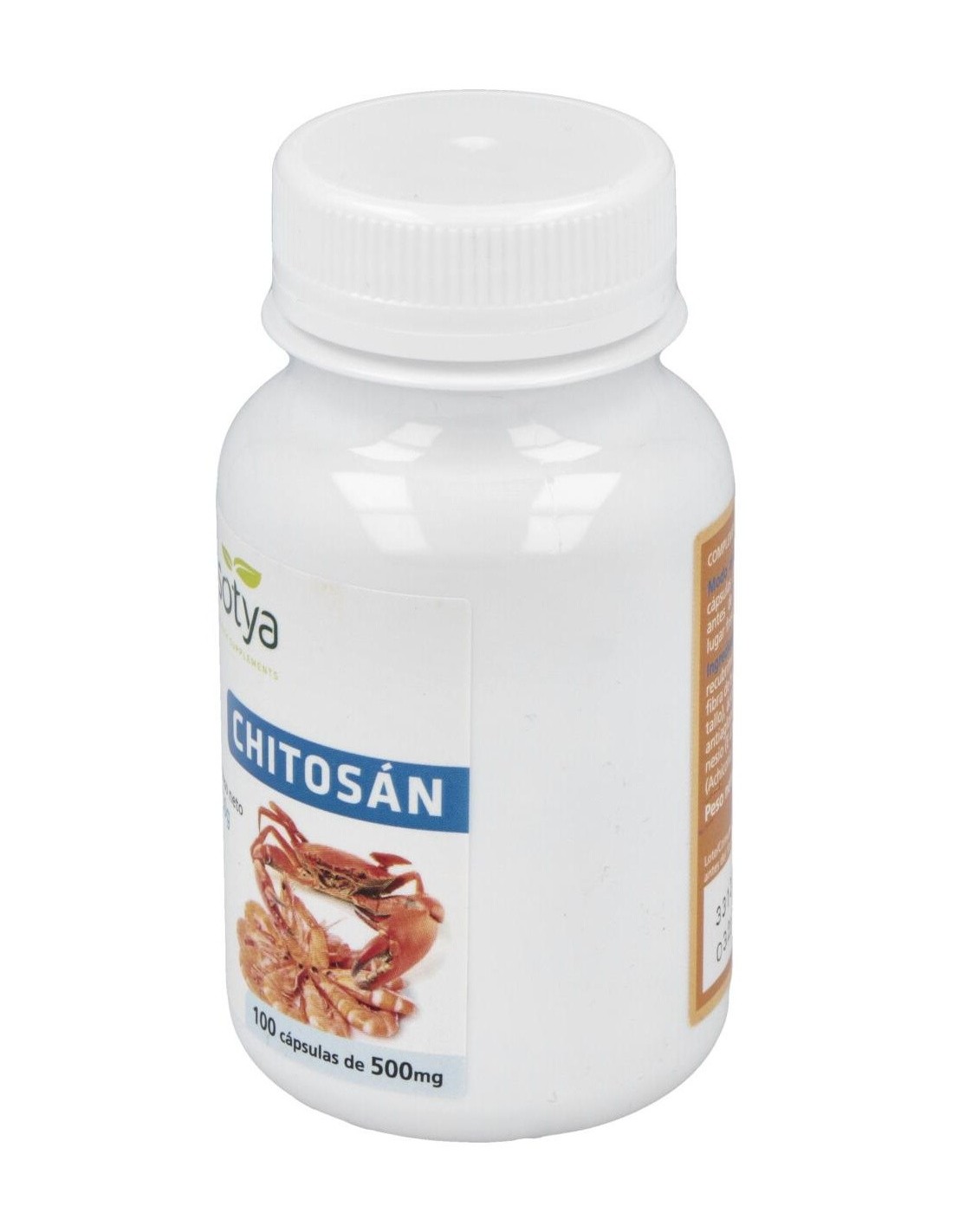 El chitosán es una fibra procedente de la cáscara de los crustáceos. Gracias a su estructura, es capaz de absorber la grasa ingerida y hacerla pasar por el intestino grueso sin metabolizar, siendo eliminada en las heces. Esta acción del chitosán es potenciado por la vitamina C. Ingredientes activos por cápsula: