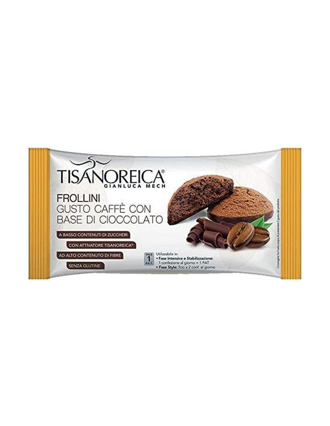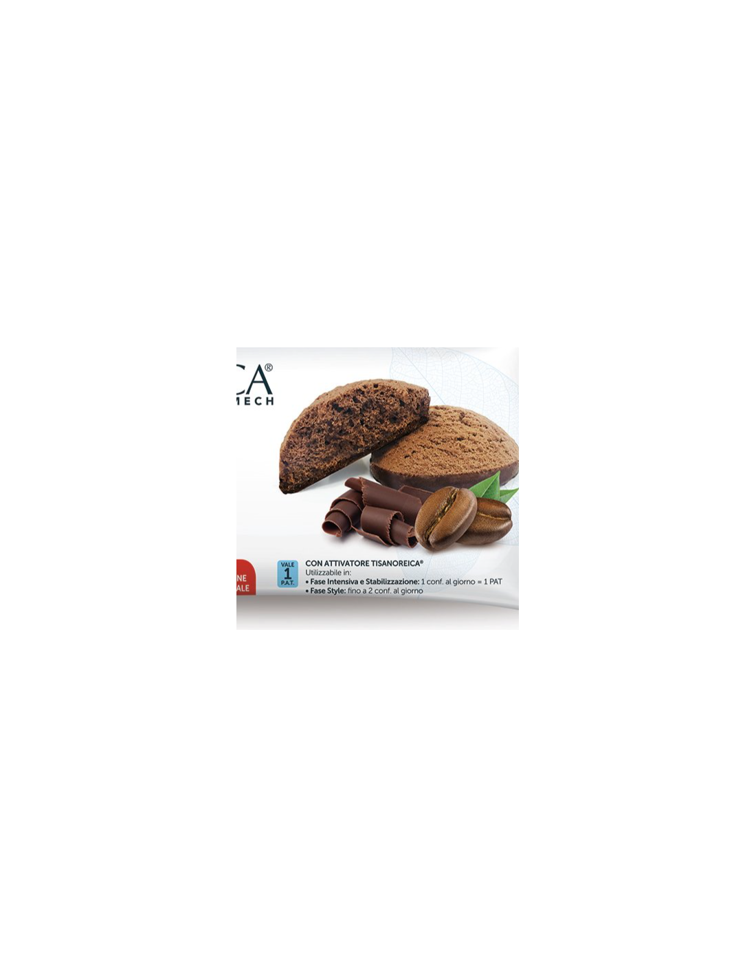 Ingredientes:Proteína de soja aislada (NO GMO), cobertura de chocolate 15%: (pasta de cacao, edulcorante: maltitol, manteca de cacao, emulgente: lecitina de soja, aroma natural de vainilla), edulcorantes: (eritritol, maltitol), aceite extra de oliva virgen, mantequilla, colágeno hidrolizado (gelatina comestible), proteínas de la leche, clara de huevo, fibra vegetal, fibra de trigo (deglutinada), espesante: goma de algarroba, clara de huevo en polvo, café instantáneo 3 %, aceite de semillas de girasol, almidón de patata, gasificantes: (difosfatos, carbonatos de sodio, bicarbonato de amonio, almidón de maíz), Activador Tisanoreica® (fibra de acacia, fruto de papaya, zumo de piña liofilizado, flor de malva, fruto de anís estrellado, fruto de hinojo, hoja de alcachofa, hoja de diente de león, partes aéreas de lespedeza, semilla de griffonia, corteza de frángula), emulgente: lecitina de soja, aromas, aroma: vainillina, sal, antioxidante: alfa-tocoferol.Valor nutricional por 50 gramos: