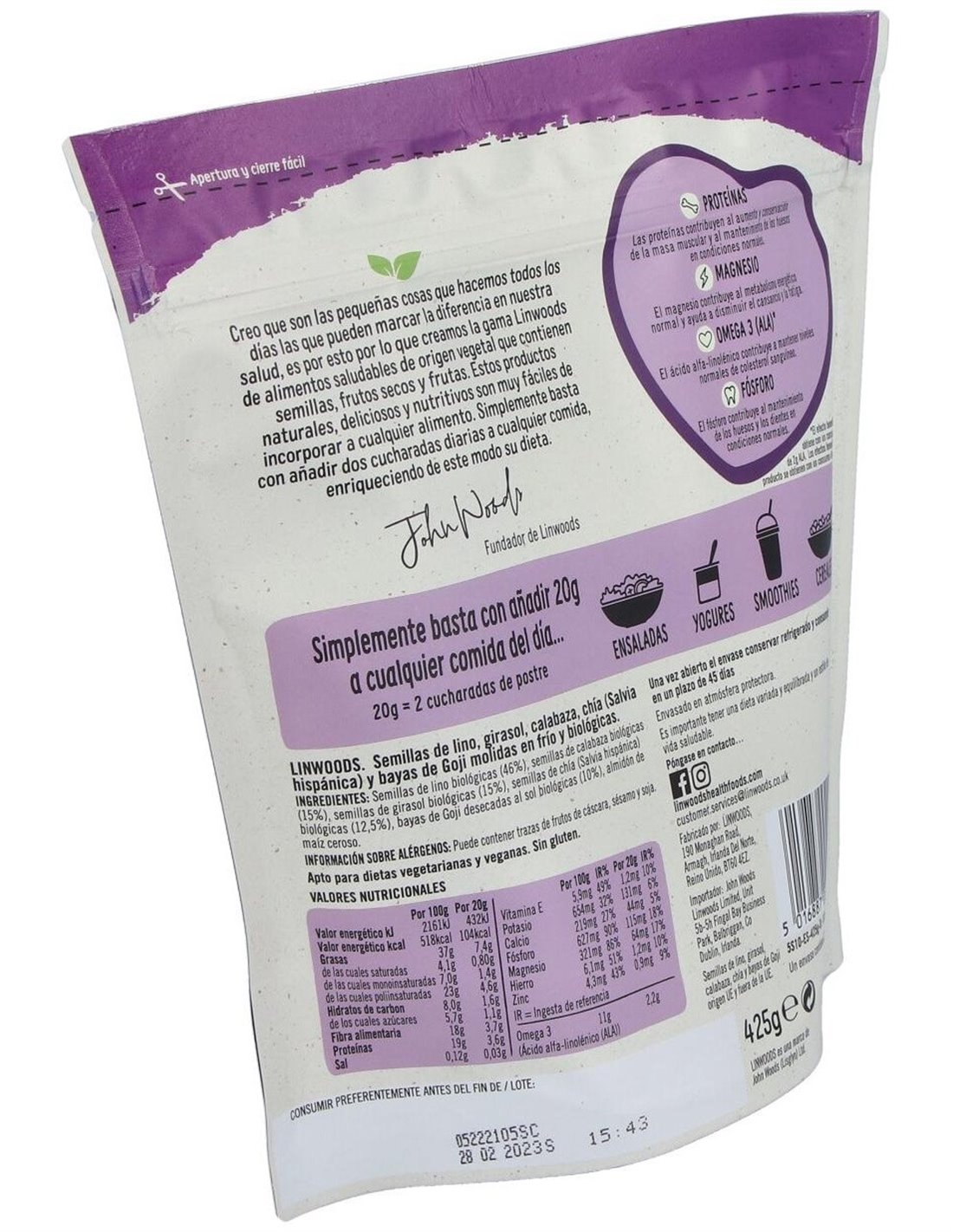 Semillas de Lino, Girasol, Calabaza, Chía y Bayas de Goji Molidas Bio 425 g de Linwoods