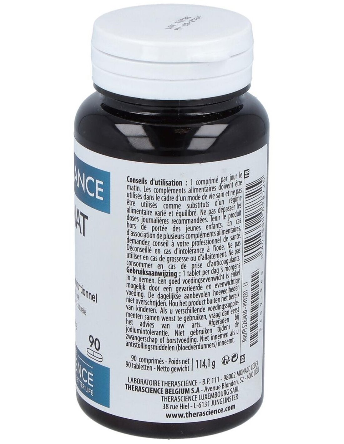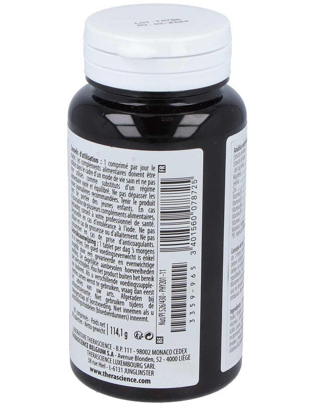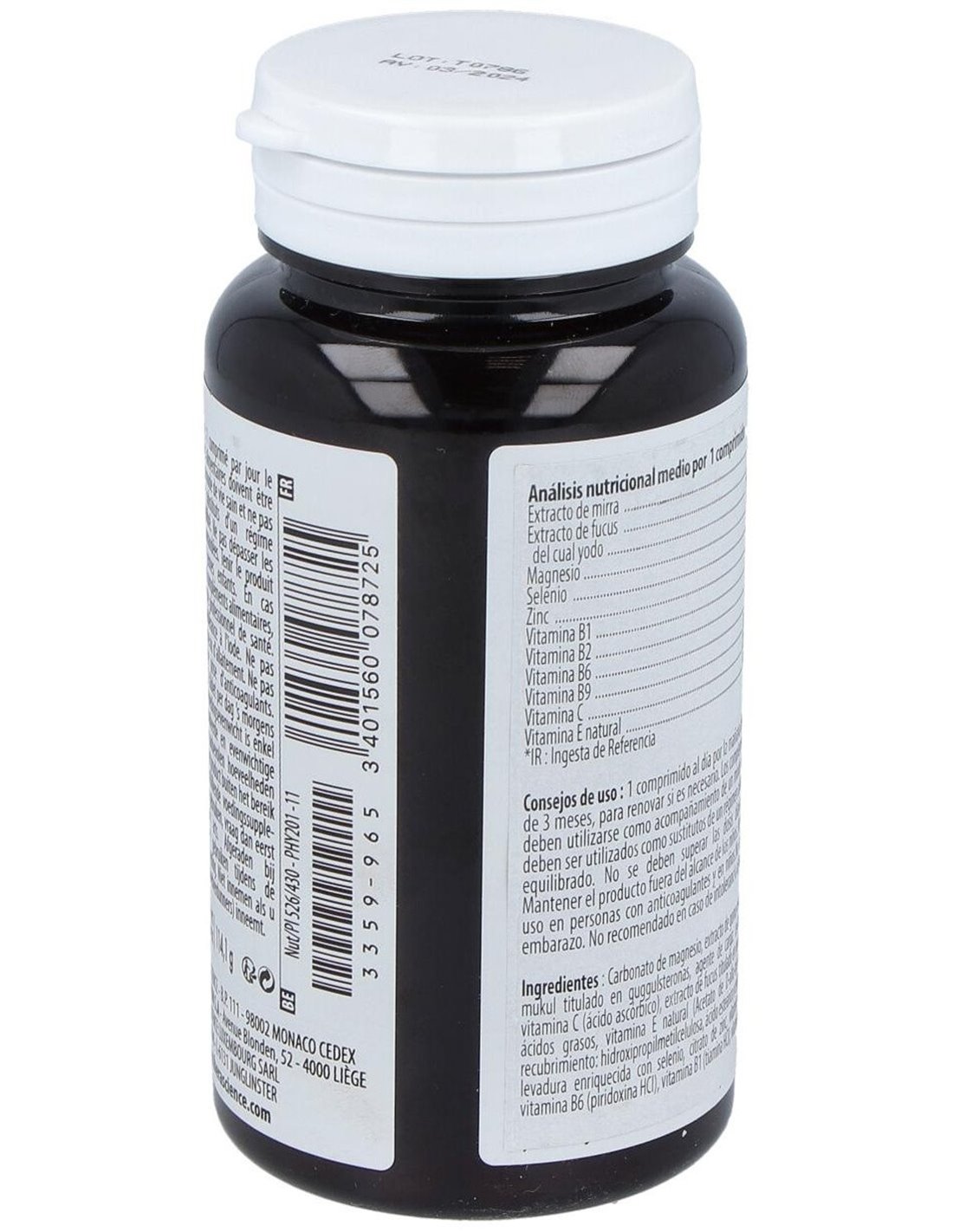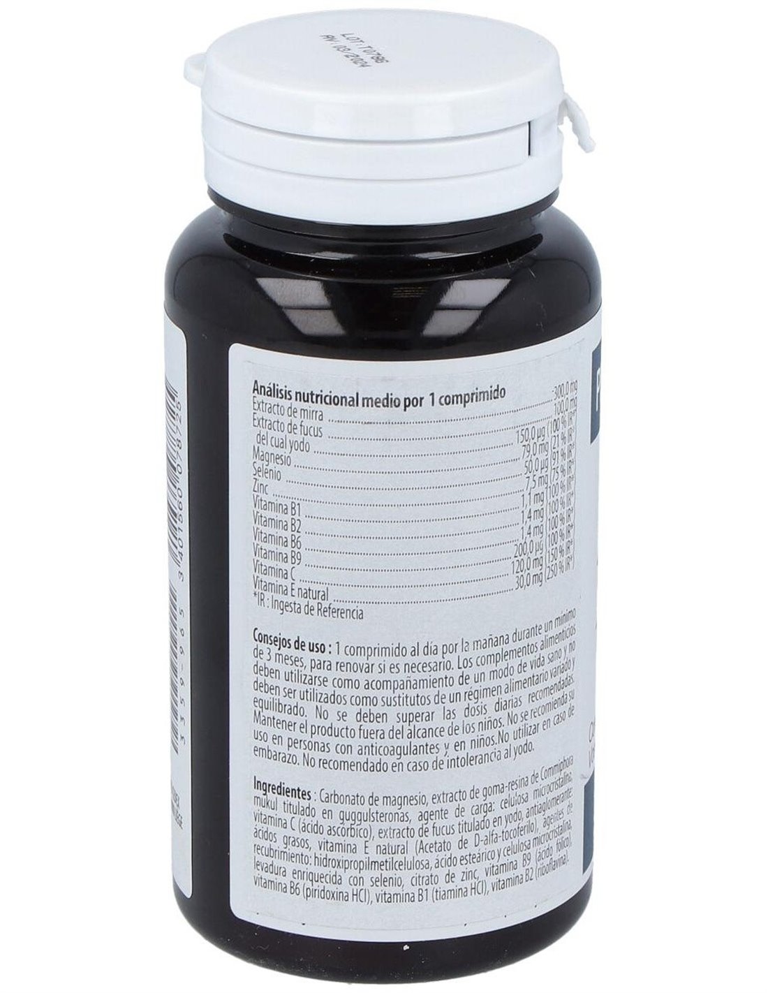 Carbonato de magnesio, Commiphora mukul (mirra) estandarizado en guggulsterones, agente de carga : celulosa microcristalina, vitamina C (ácido L áscorbico), vitamina E natural (acetato de D-alfa-tocoferilo), antiaglomerante : ácidos grasos, agentes de cobertura : hidroxipropilmetilcelulosa, ácido esteárico y celulosa microcristalina, levadura enriquecida en selenio, citrato de zinc, vitamina B9 (ácido fólico), vitamina B6 (clorhidrato de piridoxina), vitamina B1 (tiamina HCl), vitamina B2 (riboflavina), yoduro de potasio.