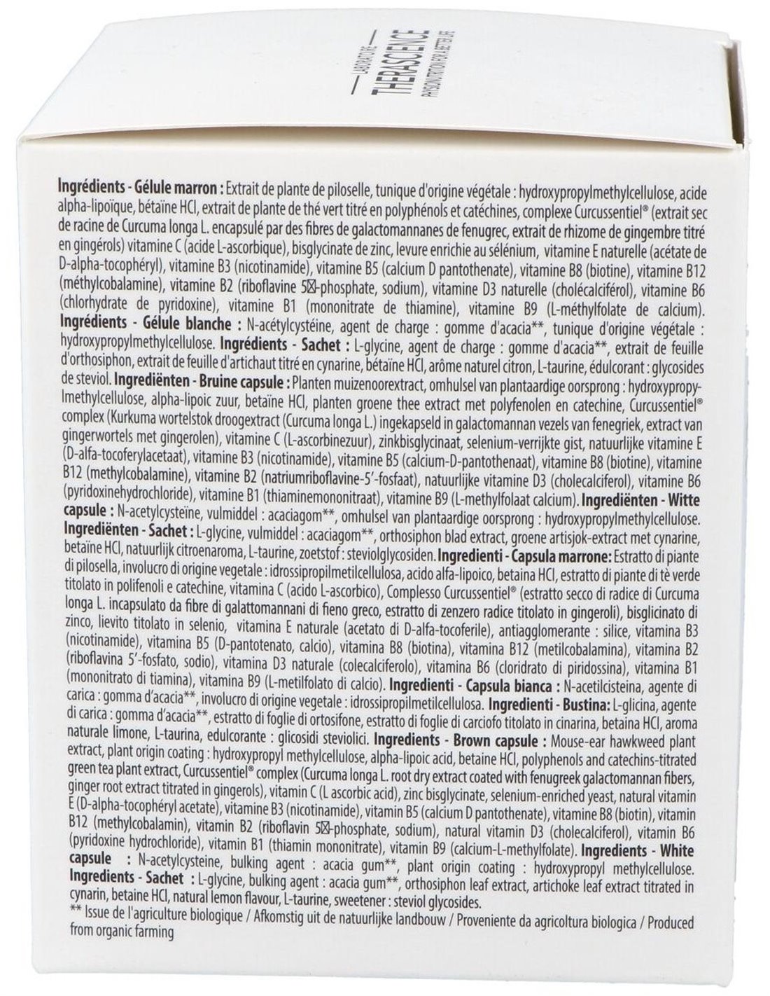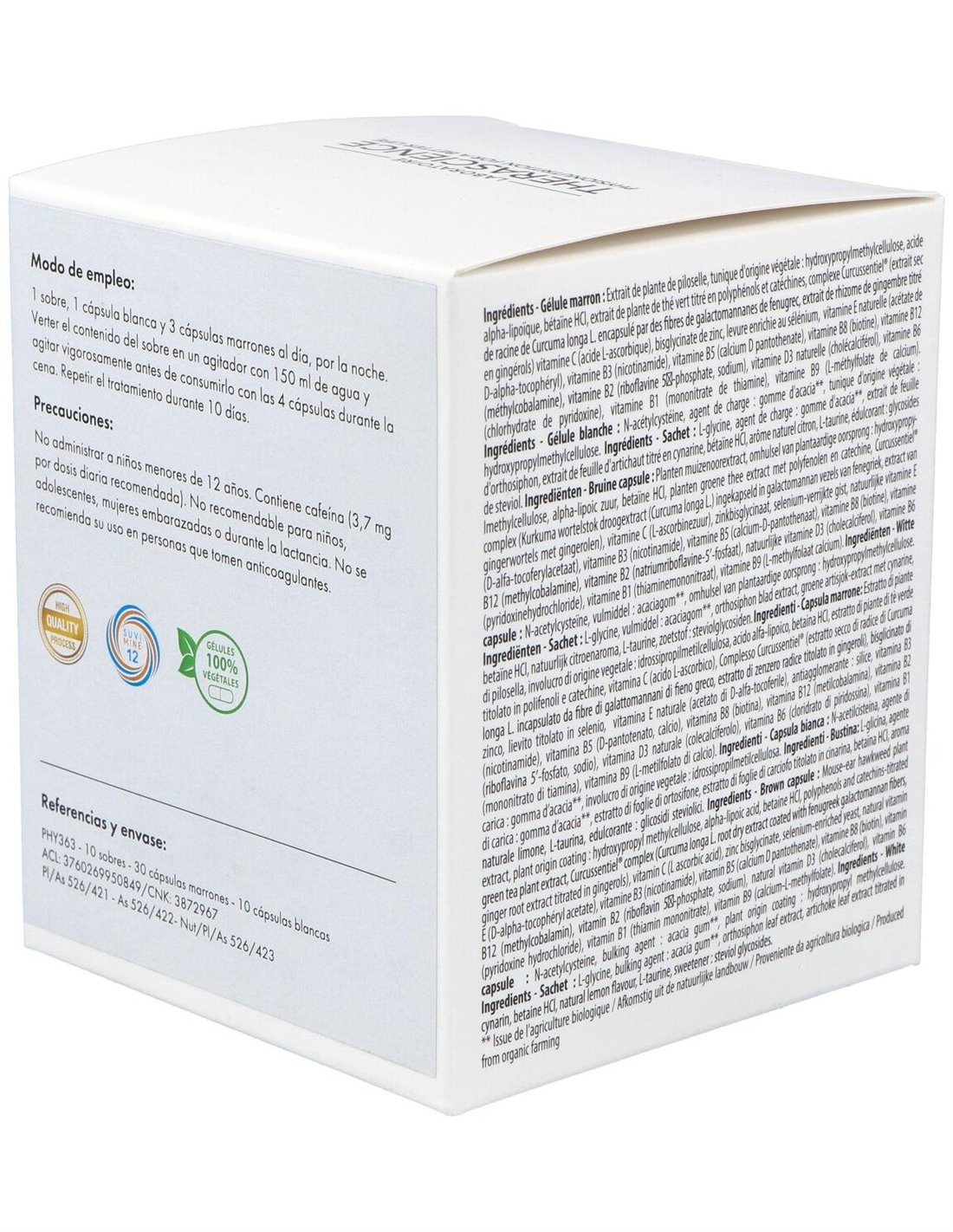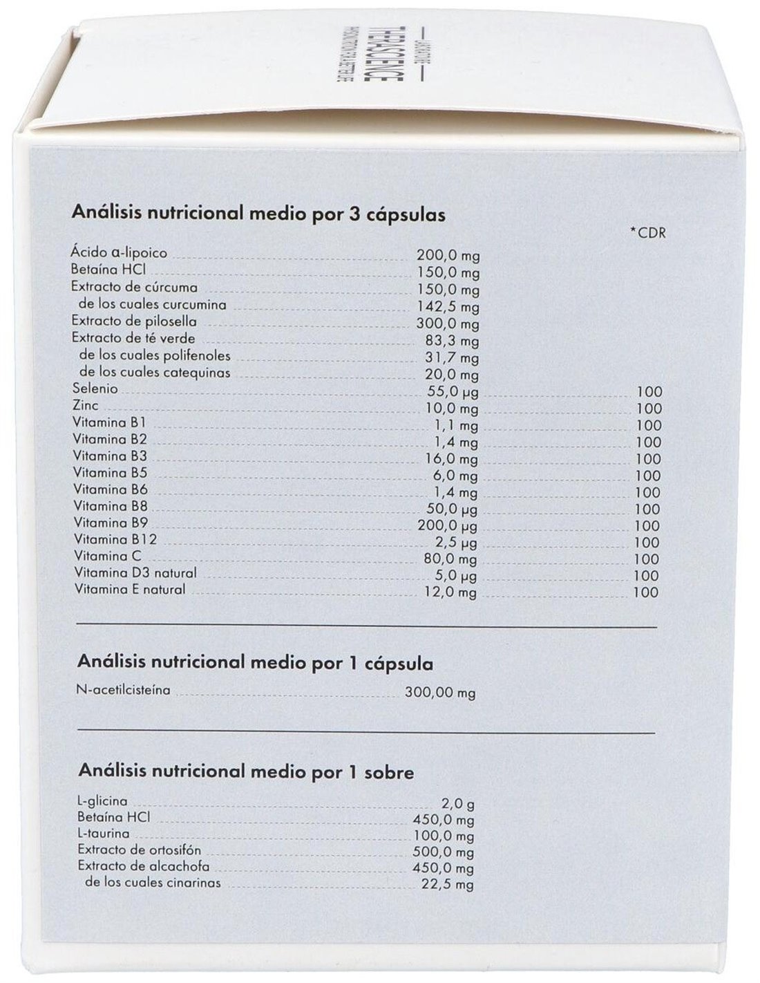 Ácido a-lipoico 200,0 mg, Betaína HCl 150,0 mg, Extracto de cúrcuma 150,0 mg de los cuales curcumina 142,5 mg, Extracto de pilosela 300,0 mg, Extracto de té verde 83,3 mg de los cuales polifenoles 31,7 mg de los cuales catequinas 20,0 mg, Selenio 55,0 µg, Zinc 10,0 mg, Vitamina B1 1,1 mg, Vitamina B2 1,4 mg, Vitamina B3 16,0 mg, Vitamina B5 6,0 mg, Vitamina B6 1,4 mg, Vitamina B8 50,0 µg, Vitamina B9 200,0 µg, Vitamina B12 2,5 µg, Vitamina C 80,0 mg, Vitamina D3 natural 5,0 µg, Vitamina E natural 12,0 mg, N-acetilcisteína 300,00 mg, L-glicina 2,0 g, Betaína HCl 450,0 mg, L-taurina 100,0 mg, Extracto de ortosifón 500,0 mg, Extracto de alcachofa 450,0 mg de los cuales cinarinas 22,5 mg