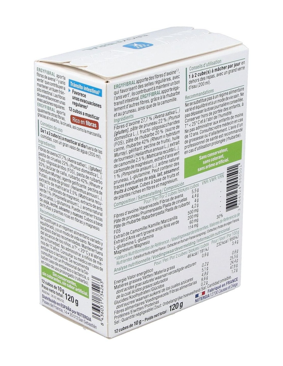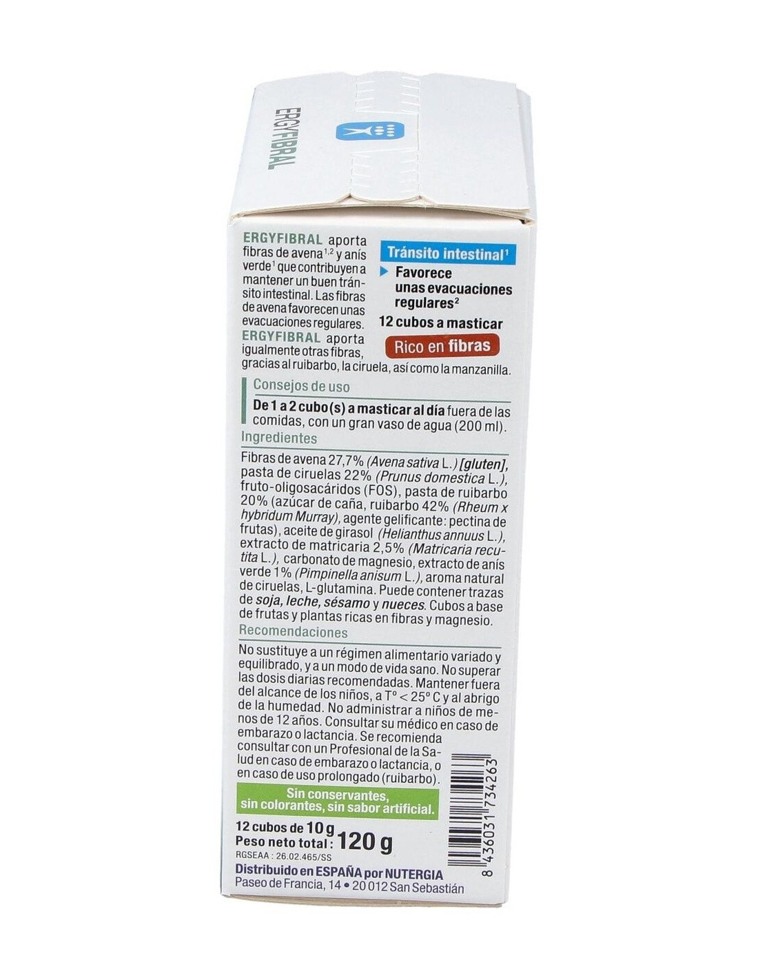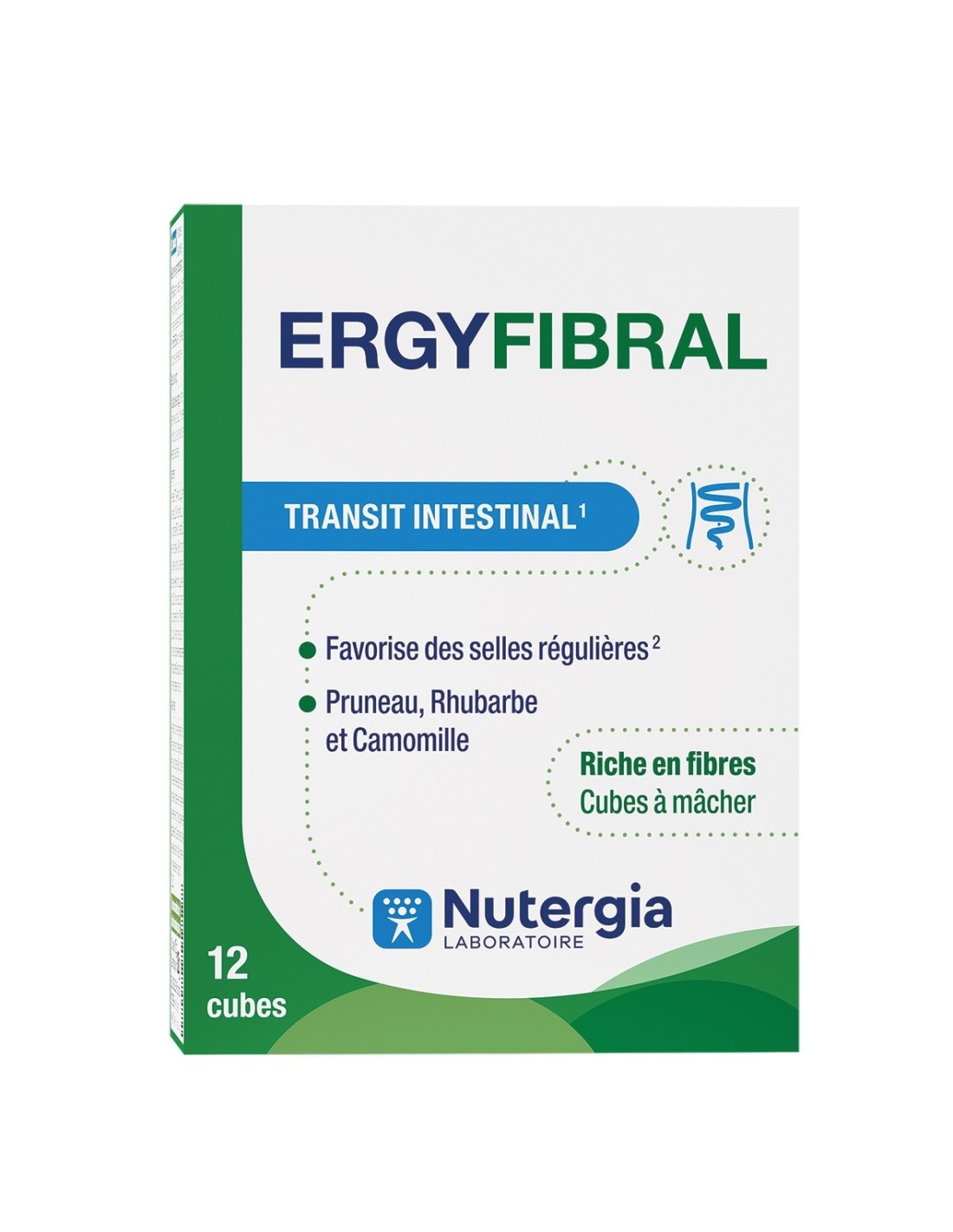 Producto rico en fibras, Ergyfibral Masticable aporta entre otros, fibras de avena que contribuyen a aumentar el volumen de las heces así como ruibarbo y ciruela, reconocidos por estimular el transito intestinal. Encontramos también extracto de anís verde y matricaria, con propiedades calmantes. Indicado en los siguientes casos: Completar una alimentación pobre en fibras. Regular un tránsito intestinal lento. Gases, hinchazones. Composición: Fibras de Avena sativa* (avena). Pasta de ruibarbo. Pasta de ciruel. Fructo-oligosacáridos (FOS). Extracto de Matricaria marítima. Carbonato de magnesio. Aceite de girasol*. Péptidos de Ceratonia siliqua (algarroba) fuente de glutamina. Extracto de Pimpinella anisum (anís verde). Sabor natural ciruela. (*) de cúltivo biológico o de origen salvaje.Modo de empleo: Masticar 1 a 2 cubos al día, preferentemente por la noche con un gran vaso de agua o una infusión. Para un efecto saciante, tomar un cubo con un gran vaso de agua 30 min antes de comer.