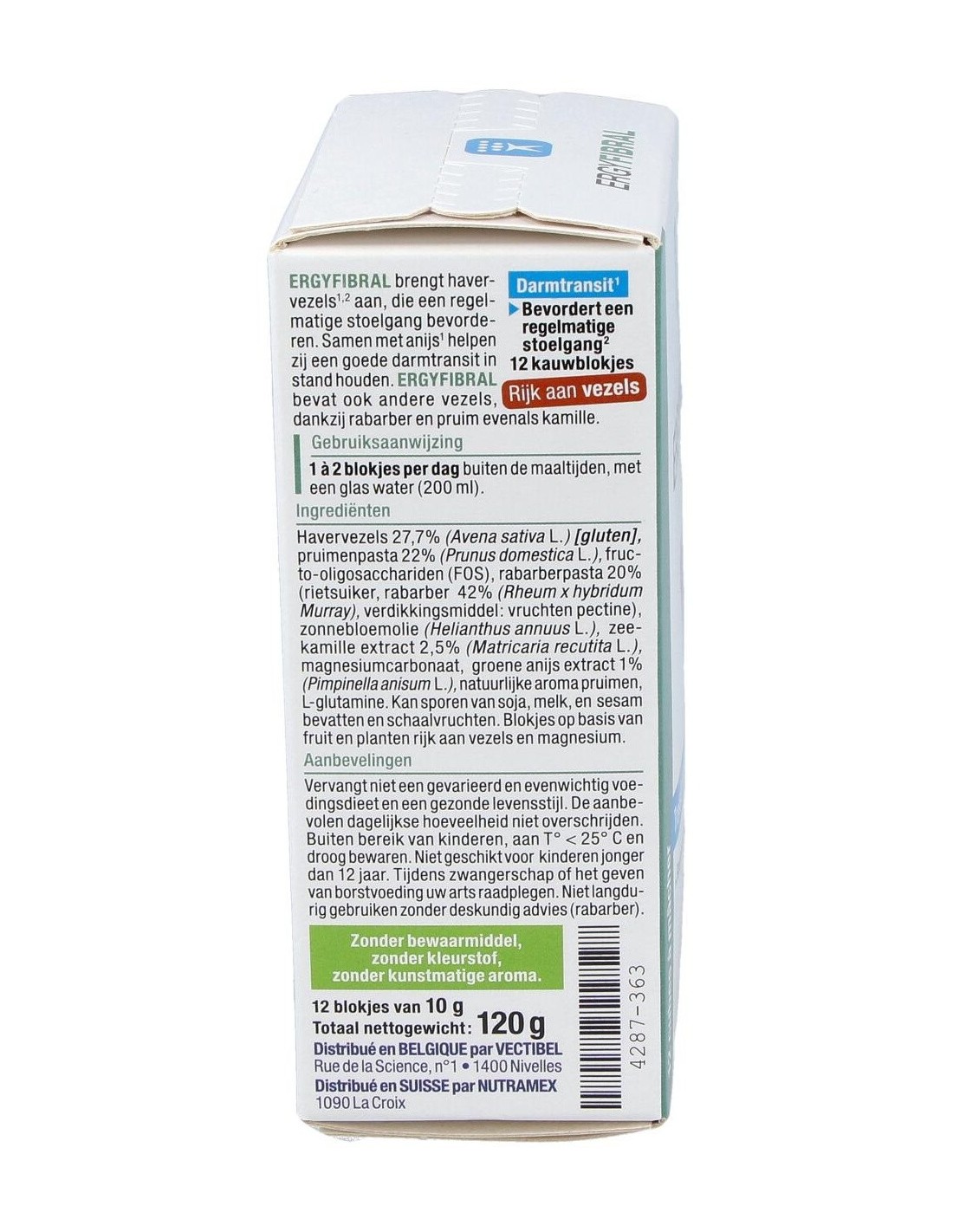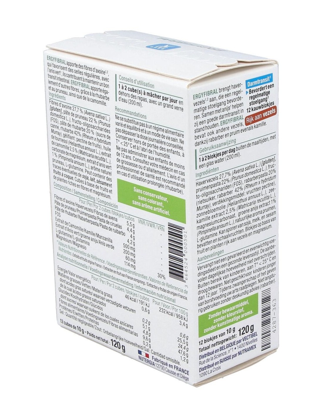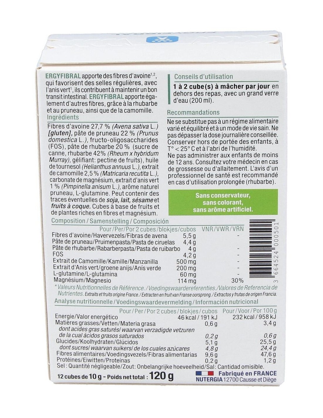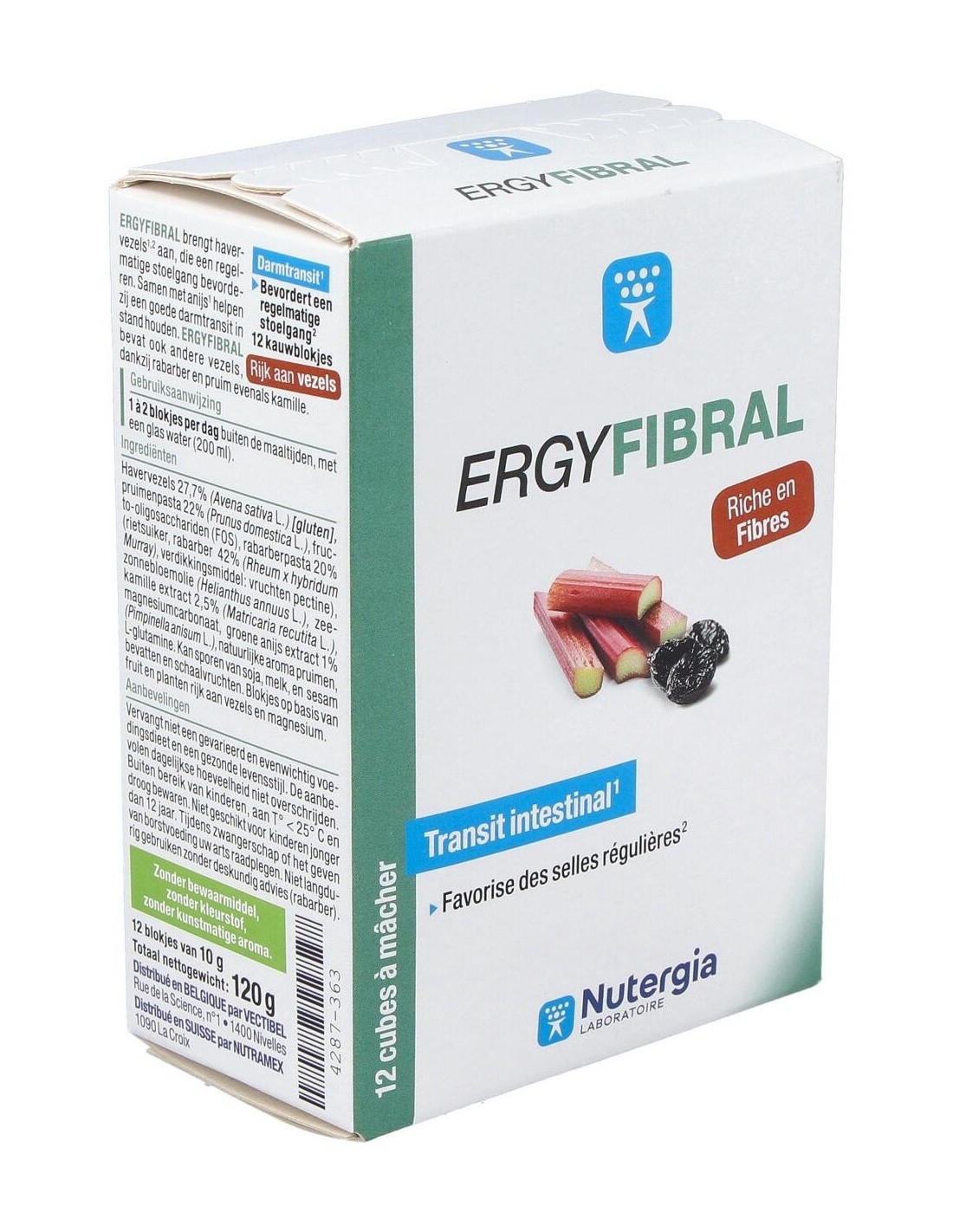 Producto rico en fibras, Ergyfibral Masticable aporta entre otros, fibras de avena que contribuyen a aumentar el volumen de las heces así como ruibarbo y ciruela, reconocidos por estimular el transito intestinal. Encontramos también extracto de anís verde y matricaria, con propiedades calmantes. Indicado en los siguientes casos: Completar una alimentación pobre en fibras. Regular un tránsito intestinal lento. Gases, hinchazones. Composición: Fibras de Avena sativa* (avena). Pasta de ruibarbo. Pasta de ciruel. Fructo-oligosacáridos (FOS). Extracto de Matricaria marítima. Carbonato de magnesio. Aceite de girasol*. Péptidos de Ceratonia siliqua (algarroba) fuente de glutamina. Extracto de Pimpinella anisum (anís verde). Sabor natural ciruela. (*) de cúltivo biológico o de origen salvaje.Modo de empleo: Masticar 1 a 2 cubos al día, preferentemente por la noche con un gran vaso de agua o una infusión. Para un efecto saciante, tomar un cubo con un gran vaso de agua 30 min antes de comer.