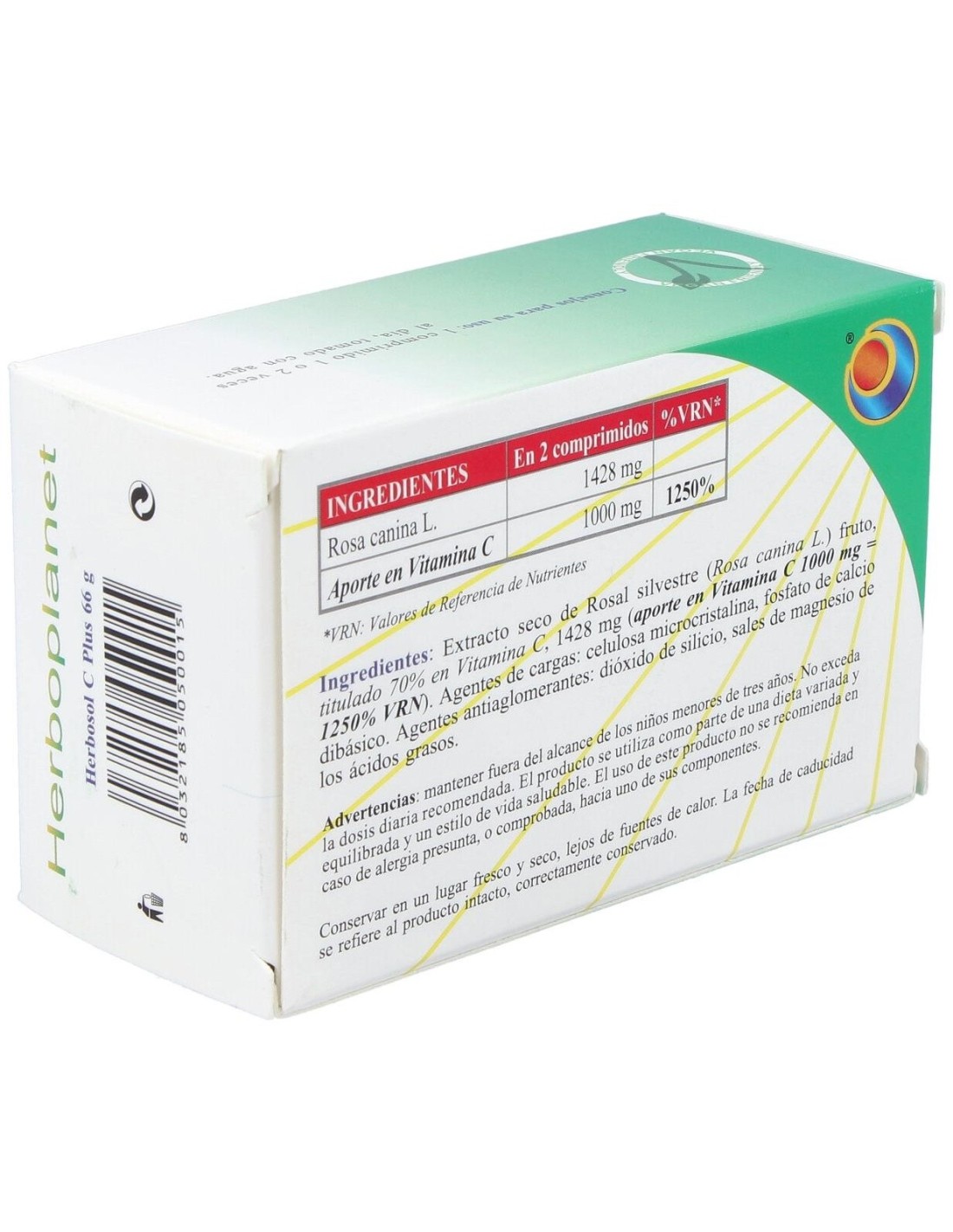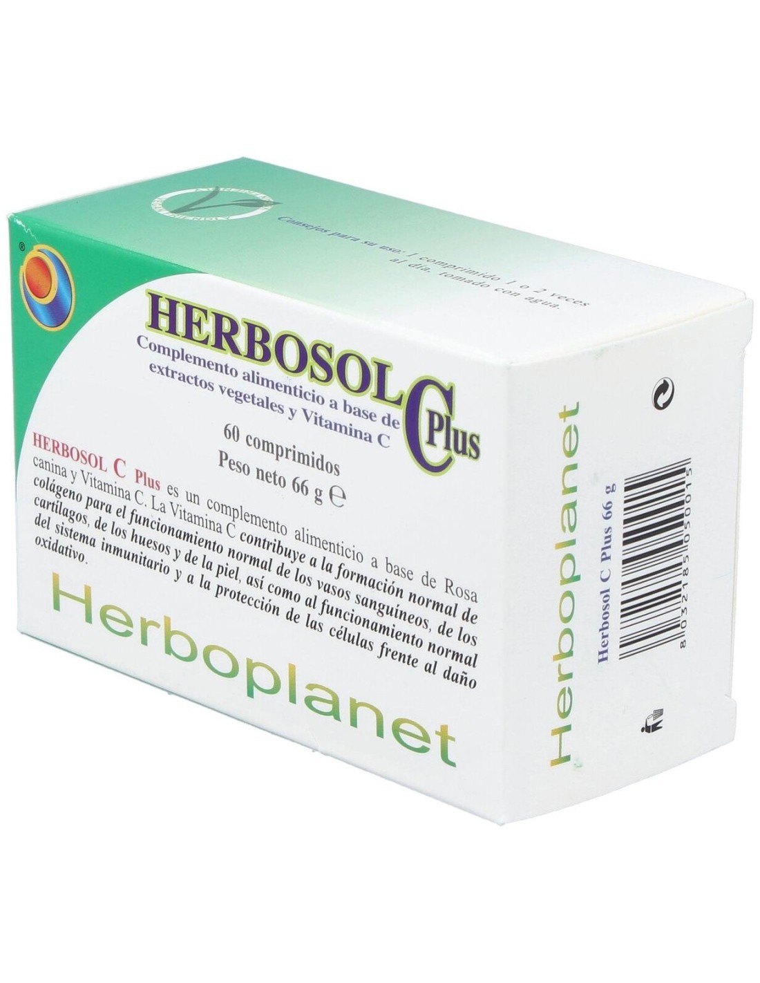 Herbosol C Plus de Herboplanet es un complemento alimenticio a base de Rosa canina y Vitamina C. La Vitamina C contribuye a la formación normal de colágeno para el funcionamiento normal de los vasos sanguíneos, de los cartilagos, de los huesos y de la piel, así como al funcionamiento normal del sistema inmunitario y a la protección de las células frente al daño oxidativo.Herbosol C Plus de Herboplanet es un producto de acción antioxidante, contrasta el estrés oxidativo, favorece la absorción de Calcio y Hierro, favorece la formación de colágeno para los cartílagos y la piel. Fortifica las paredes de arterias y vasos capilares. Reconstituyente. Sostiene el Sistema Inmunitario.Ingredientes por 2 comprimidos:Extracto seco de Rosal silvestre (Rosa canina) frutos, titulada al 70% en vitamina C 1428 mg (aporte en Vitamina C natural 1000 mg). Agentes de carga: celulosa microcristalina, fosfato de calcio dibasico. Antiaglomerantes: sales de magnesio de los ácidos grasos, dióxido de silicio.Modo de empleo:Tomar 1 comprimido, una o dos veces al día.Presentación:Envase de 60 comprimidos.