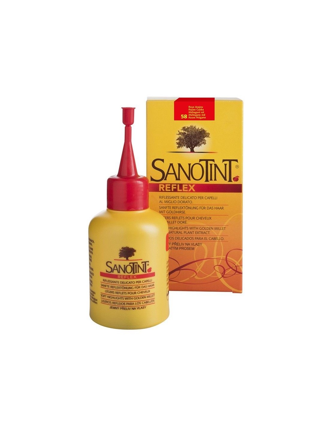 Sanotint Reflex es un producto a base de plantas con extractos de manzanilla, quino, hojas de olivo y mijo dorado que interactúan entre sí y dan reflejos brillantes y vivos al cabello creando diferentes tonos desde el negro hasta el rojo intenso cálido. Al no ser un tinte, los pigmentos del reflejo no penetran en el cabello, sino que solo recubren la parte externa del mismo, por lo que el color se elimina gradualmente en 5 a 6 lavados.Sanotint Reflex cubre delicadamente el cabello blanco, pero no de manera permanentemente como un tinte. Sanotint Reflex está listo para usar. No es necesario mezclar los componentes antes de la aplicación.Ingredientes (INCI):Extractos vegetales de camomila, mijo dorado, hoja de olivo (aguamarina, metoxiisopropanol, cocamidopropil betaína, hidroxietilcelulosa, parfum, laurdimonio, hidroxipropilo, proteína de trigo hidrolizada, poliquaternium-22, propilenglicol, hidróxido de sodio, extracto de acetato de pantóxido, pantóxido de pantopropileno, extracto de acetato de pantóxido de pantodio, extractor de sodio, extracto de acetato de pacóxido de sodio, extracto de pantoruro de sodio y ácido clorhídrico. Extracto de hoja de Olea europaea, extracto de Cinchona, extracto de Chamomilla recutita, butilparabeno, etilparabeno, propilparabeno, metilparabeno, fenoxietanol, ácido sórbico, caprilil glicol, linalool).Modo de empleo:Seguir atentamente las instrucciones que encontrarás en el interior.Presentación:El envase contiene:
