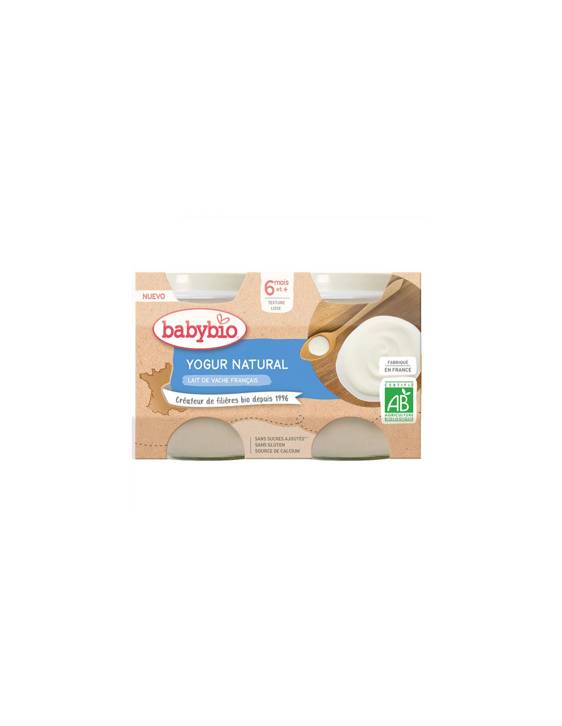 BABYBIOYogur natural a base de leche de vaca ecológica. Gran fuente de calcio, con ingredientes procedentes de la agricultura ecológica. Sin gluten. Sin azúcares añadidos.
