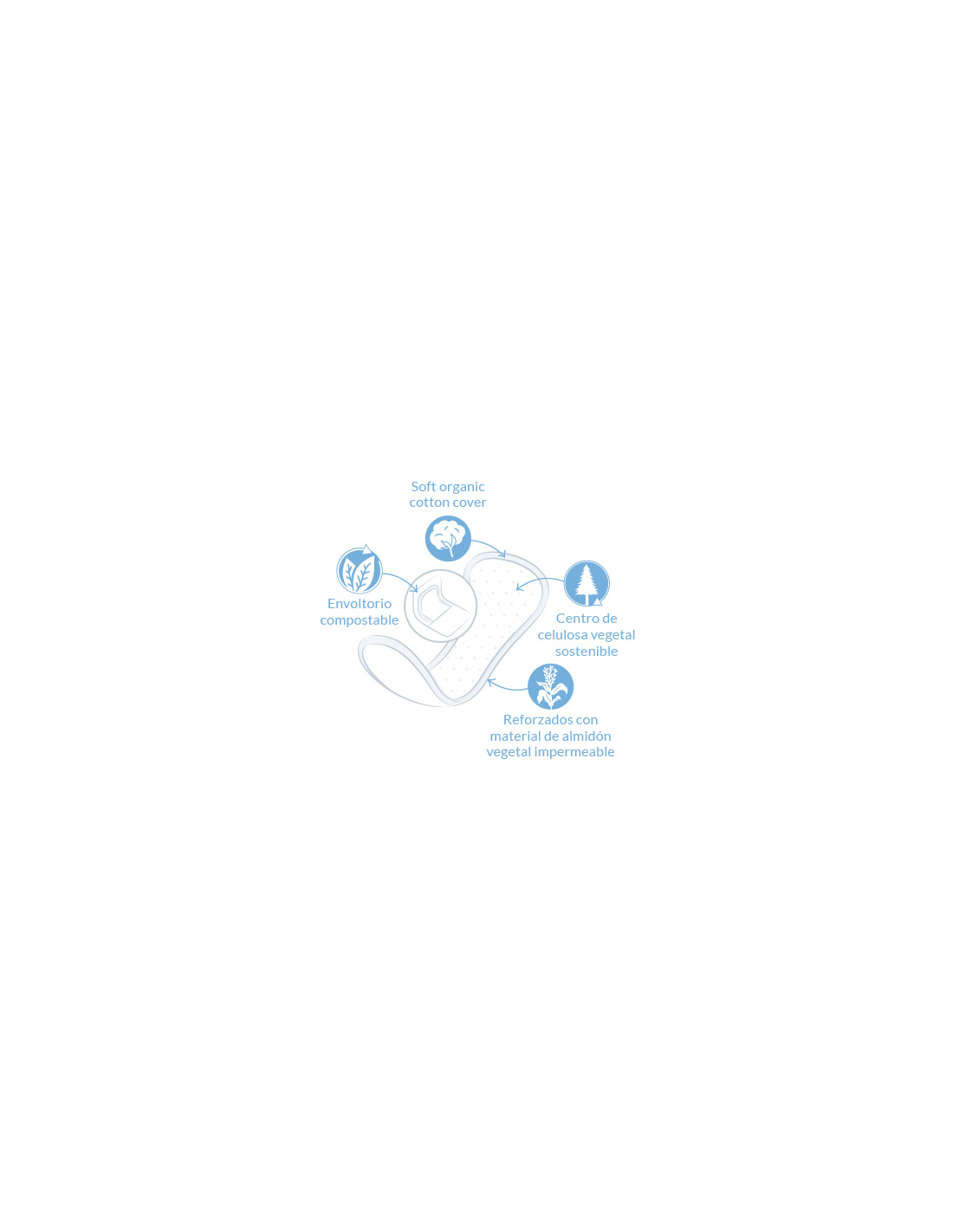 Ingredientes: Algodón orgánico, pulpa de celulosa ecológicamente, almidón de maíz sin OGM