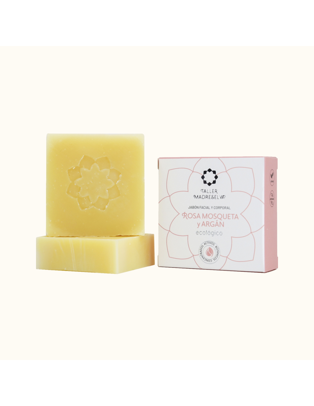 El Jabón de Rosa Mosqueta y Argán Ecológico cuida la piel de tu rostro y cuerpo, elimina las toxinas acumuladas durante el día y te proporciona una experiencia única. No reseca la piel y no deja sensación de tirantez.