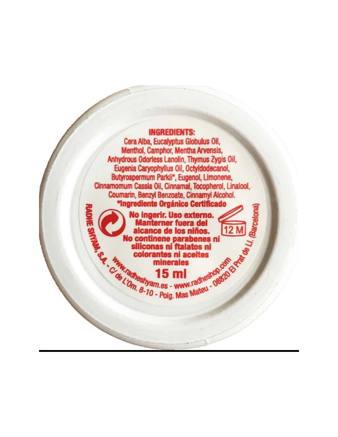 INGREDIENTS: Cera Alba, Eucalyptus Globulus Oil, Menthol, Camphor, Mentha Arvensis, Anhydrous Odorless Lanolin, Thymus Zygis Oil, Eugenia Caryophyllus Oil, Octyldodecanol, Butyrospermum Parkii*, Eugenol, Limonene, Cinnamomum Cassia Oil, Cinnamal, Tocopherol, Linalool, Coumarin, Benzyl Benzoate, Cinnamyl Alcohol.