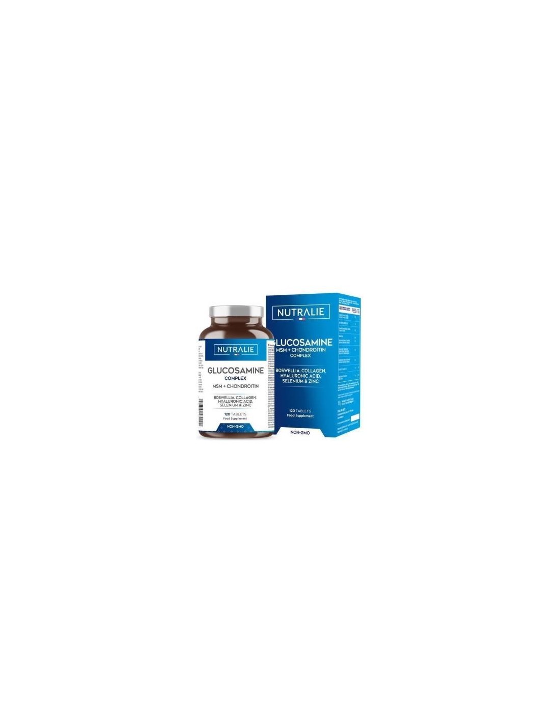 Ingredientes:Sulfato de glucosamina, Sulfato de condroitina, MSM (Metilsulfonilmetano), extracto seco Boswellia serrata (Boswellia serrata Roxb. ex Colebr., oleorresina), colágeno hidrolizado, hialuronato sódico, citrato de Zinc, agente de carga (celulosa microcristalina), antiaglomerantes (estearato de magnesio, dióxido de silicio), L-seleniometionina.Modo de empleo:Tomar 2 comprimidos al día con un vaso de agua.Presentación:Envase de 120 comprimidos.