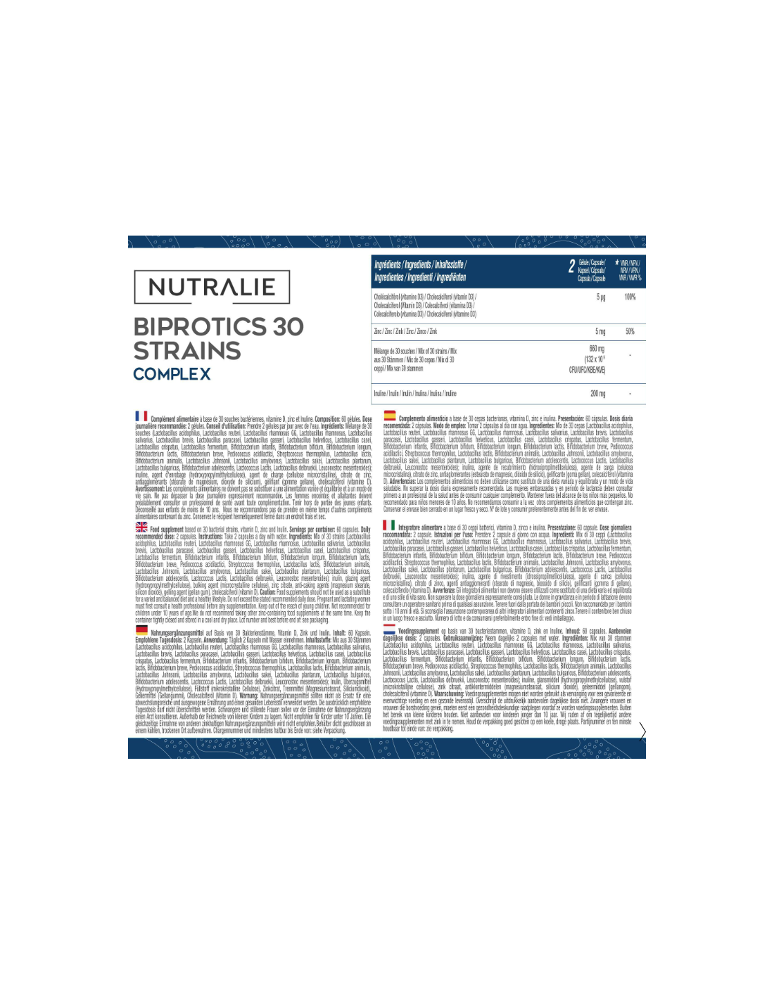 Biprotics 30 Cepas Complex de Nutralie se caracteriza por presentar una combinación de 30 cepas que se complementan entre ellas. Cada dosis, compuesta por dos cápsulas, contiene 132 mil millones de UFC (Unidades Formadoras de Colonias) durante toda la vida útil del producto.Biprotics 30 Cepas Complex se encuentran cepas que pertenecen al grupo de los lactobacilos, bifidobacterias, pediococcus, streptococos, lactococcus y leuconostoc. Por un lado los lactobacilos son un tipo de bacterias benignas que normalmente viven en los sistemas digestivo, urinario y genital. Por otro lado, las bifidobacterias son un tipo de bacteria que se asienta en los intestinos.La combinación de zinc y vitamina D nos aporta un valor añadido, tanto la vitamina D como el zinc contribuyen al funcionamiento normal del sistema inmunitario. El zinc, además, contribuye a la protección de las células frente al daño oxidativo. Este complemento también está enfocado al sistema digestivo ya que el zinc presente en la fórmula, contribuye al metabolismo normal de los hidratos de carbono, macronutrientes y los ácidos grasos.Composición activa por 2 cápsulas :