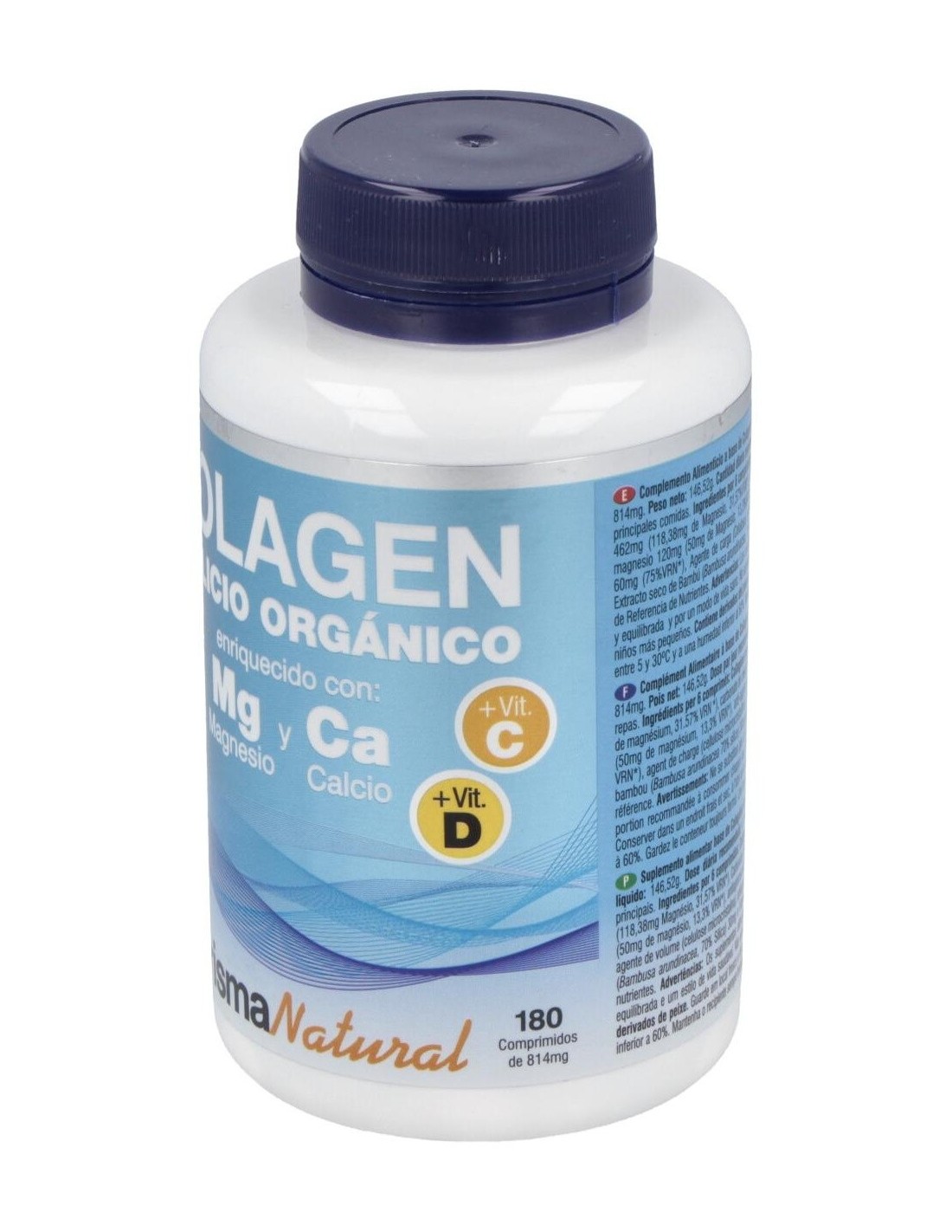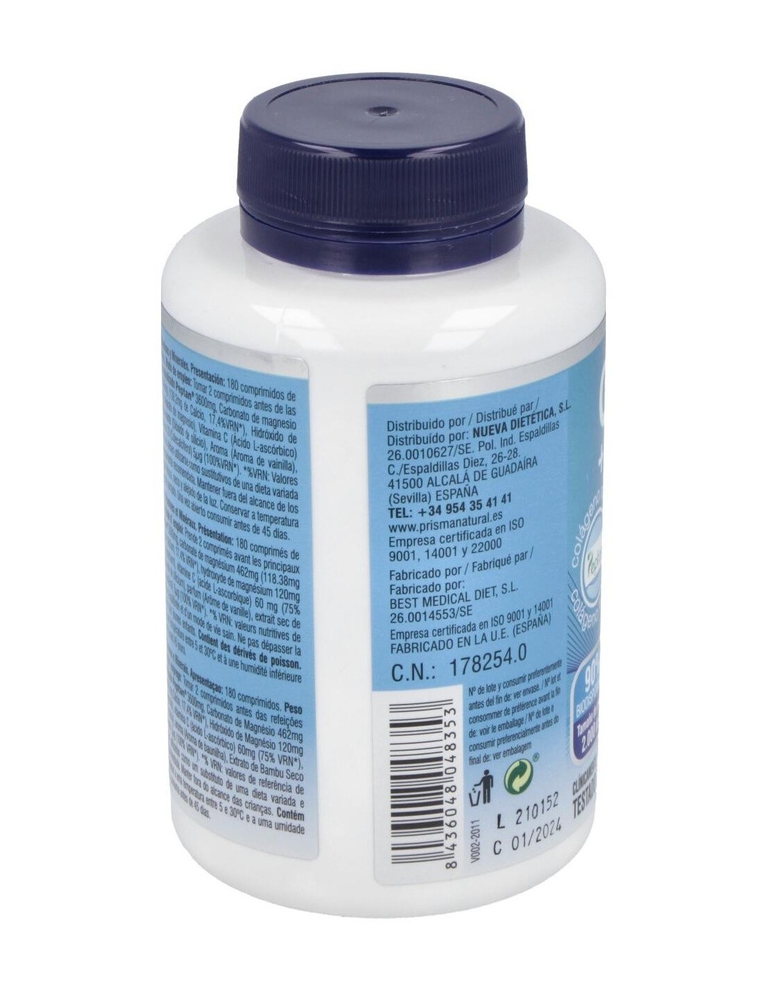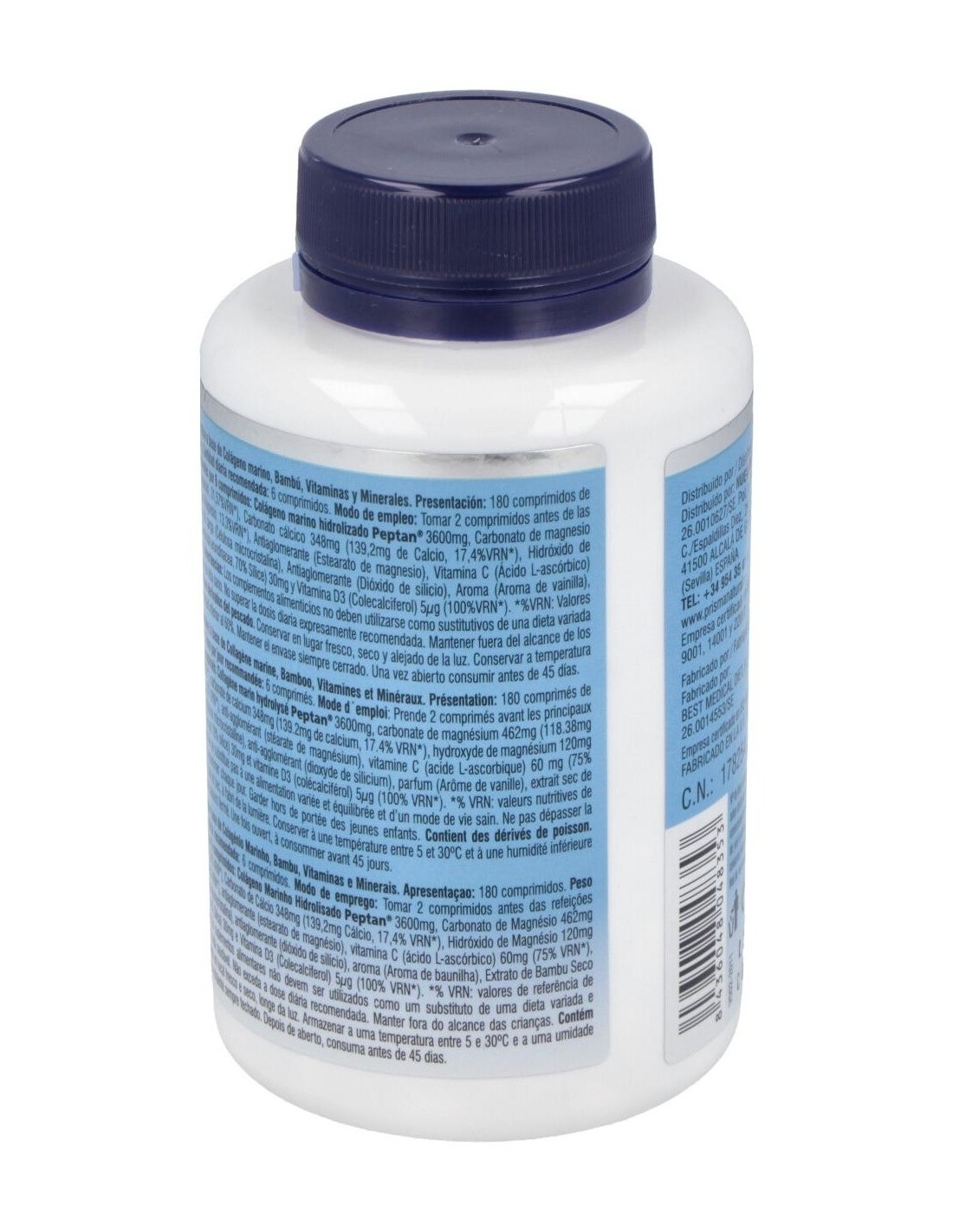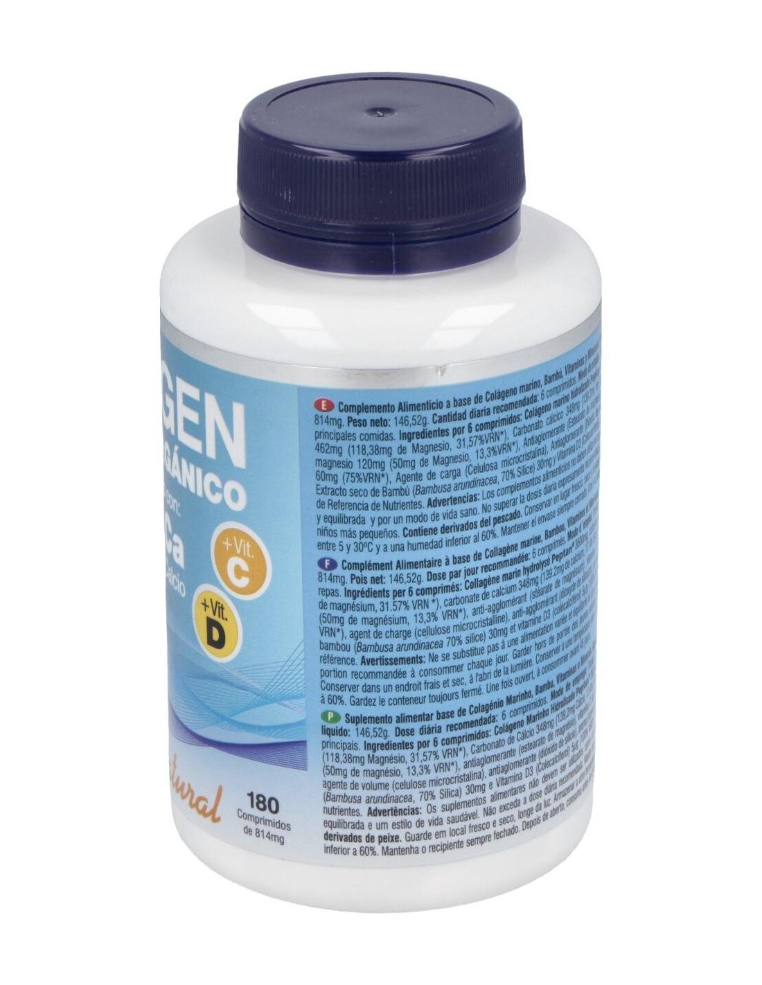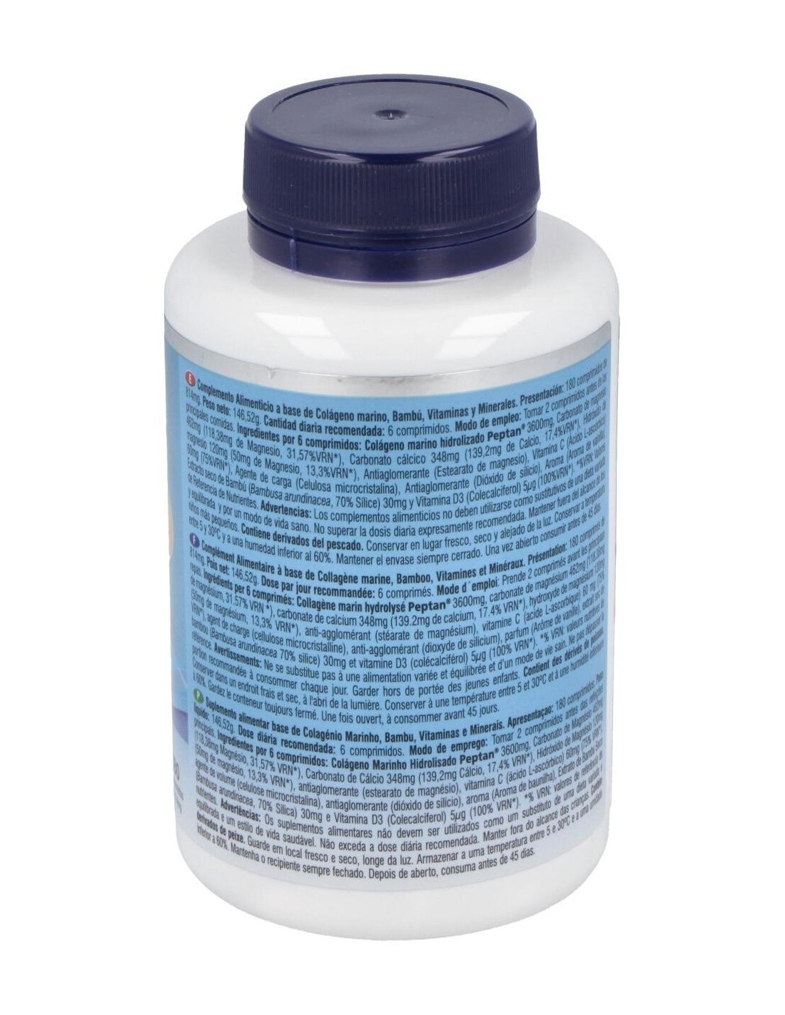 Colágeno marino hidrolizado 3600 mg, Carbonato de magnesio 462 mg (118,38 mg de Magnesio), Carbonato cálcico 348 mg (139,2 mg de Calcio), Hidróxido de magnesio 120 mg (72 mg de Magnesio), Agente de carga (Celulosa microcristalina), Antiaglomerantes (Estearato de magnesio y Dióxido de silicio), Vitamina C (Ácido l-ascórbico) 60 mg, Bambú (Bambusa arundinacea Retz (Willd.), 70% Silicio) 30 mg y Vitamina D (Colecalciferol) 5 µg.