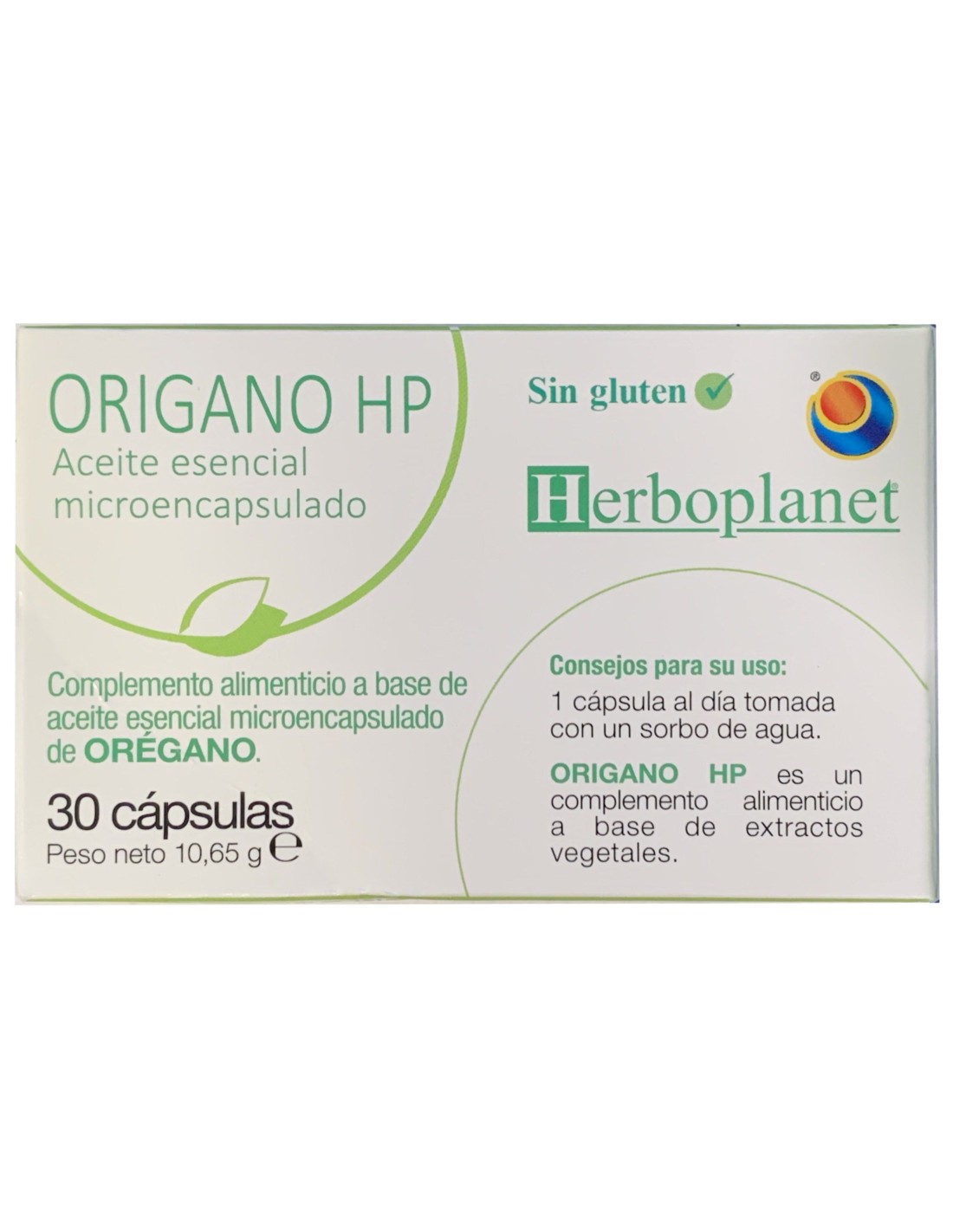 Composición activa por cápsula:127,5 mg de aceite esencial de orégano (Origanum vulgare L.).Ingredientes:Agente de carga: celulosa microcristalina. Aceite esencial de orégano (Origanum vulgare L.) 127,5 mg. Hidroxipropilmetilcelulosa. Antiaglomerante: sales magnésicas de ácidos grasos.Modo de empleo:Tomar 1 cápsula al día con agua.Presentación:Envase de 30 cápsulas.Recomendaciones y advertencias:No contiene gluten.