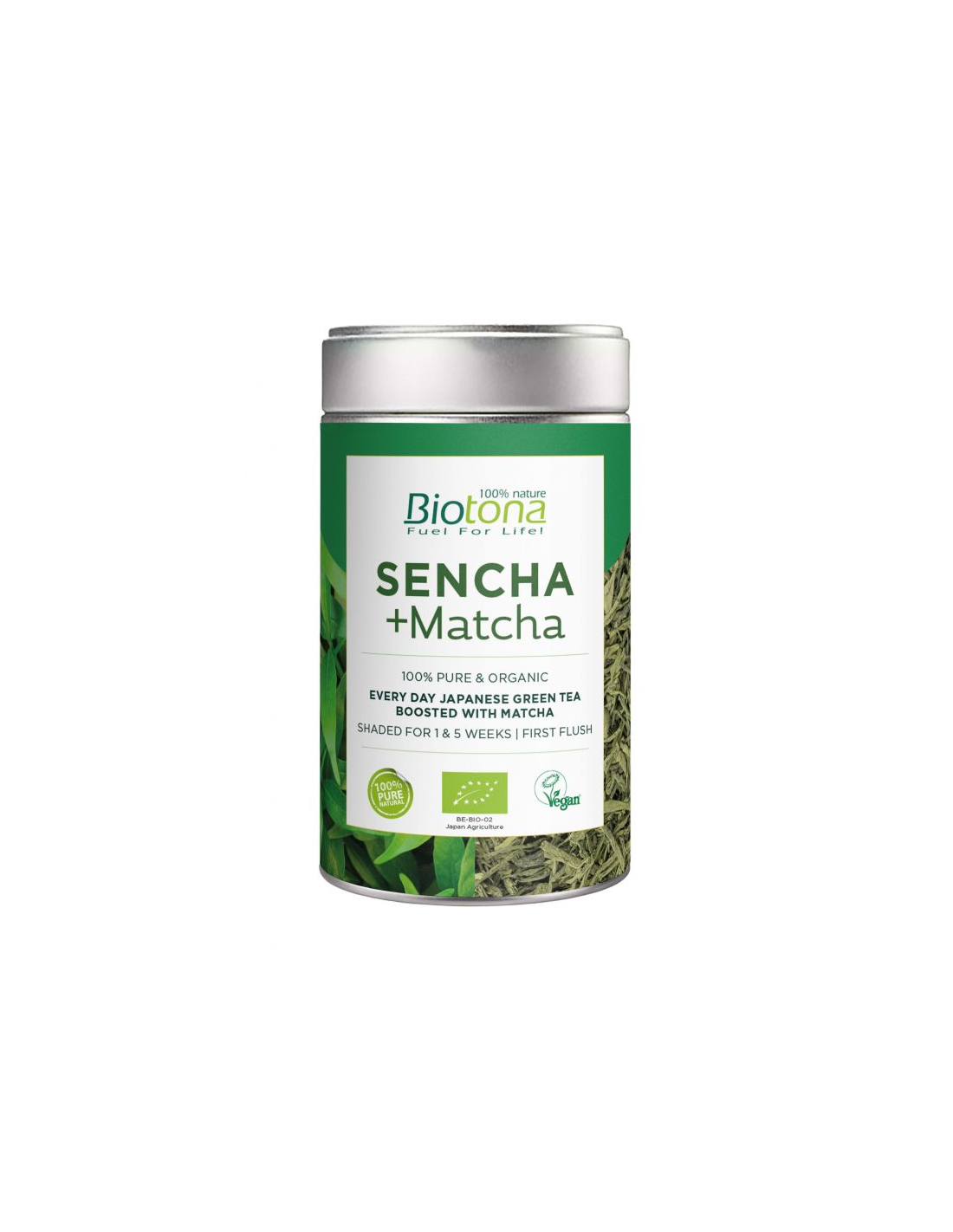Té Sencha + Matcha de Biotona es una mezcla de hojas sueltas de té verde Sencha y polvo de Matcha que combina perfectamente los sabores complementario