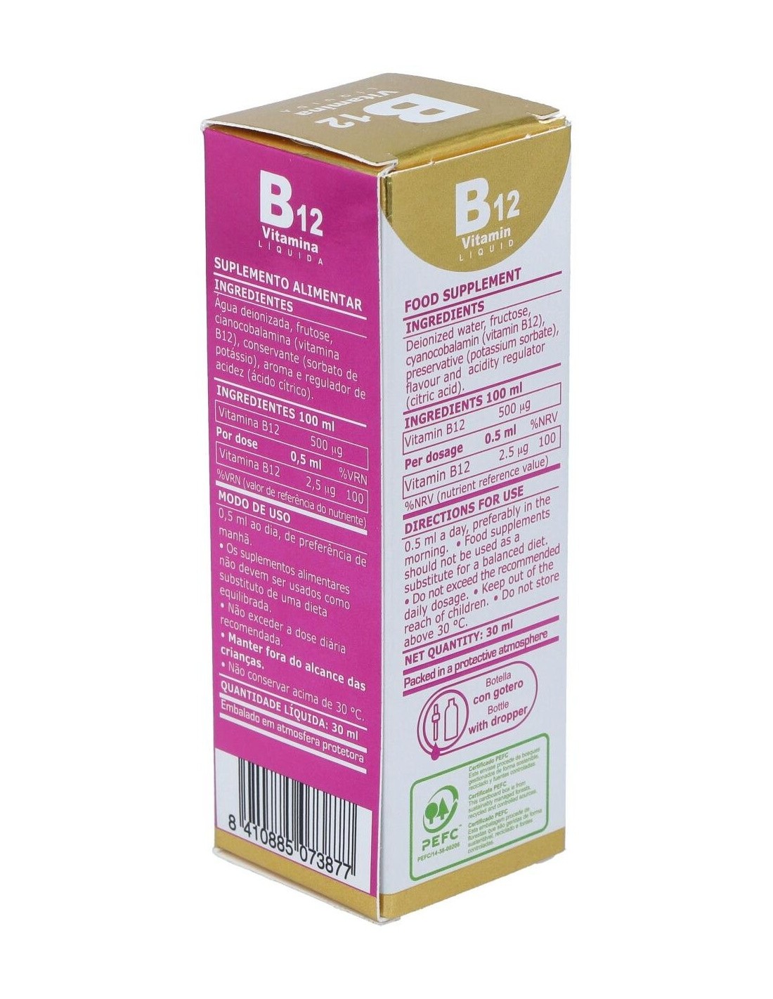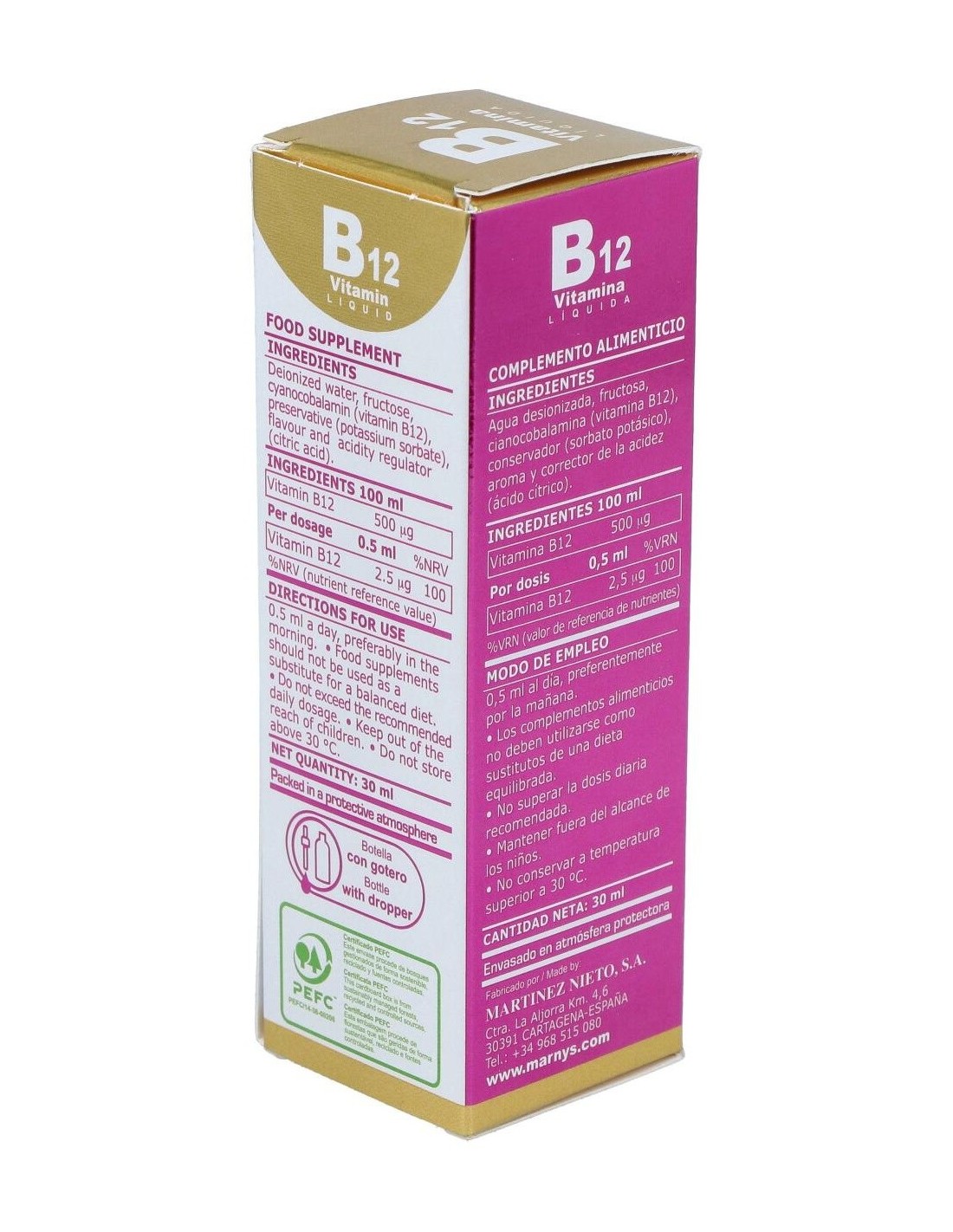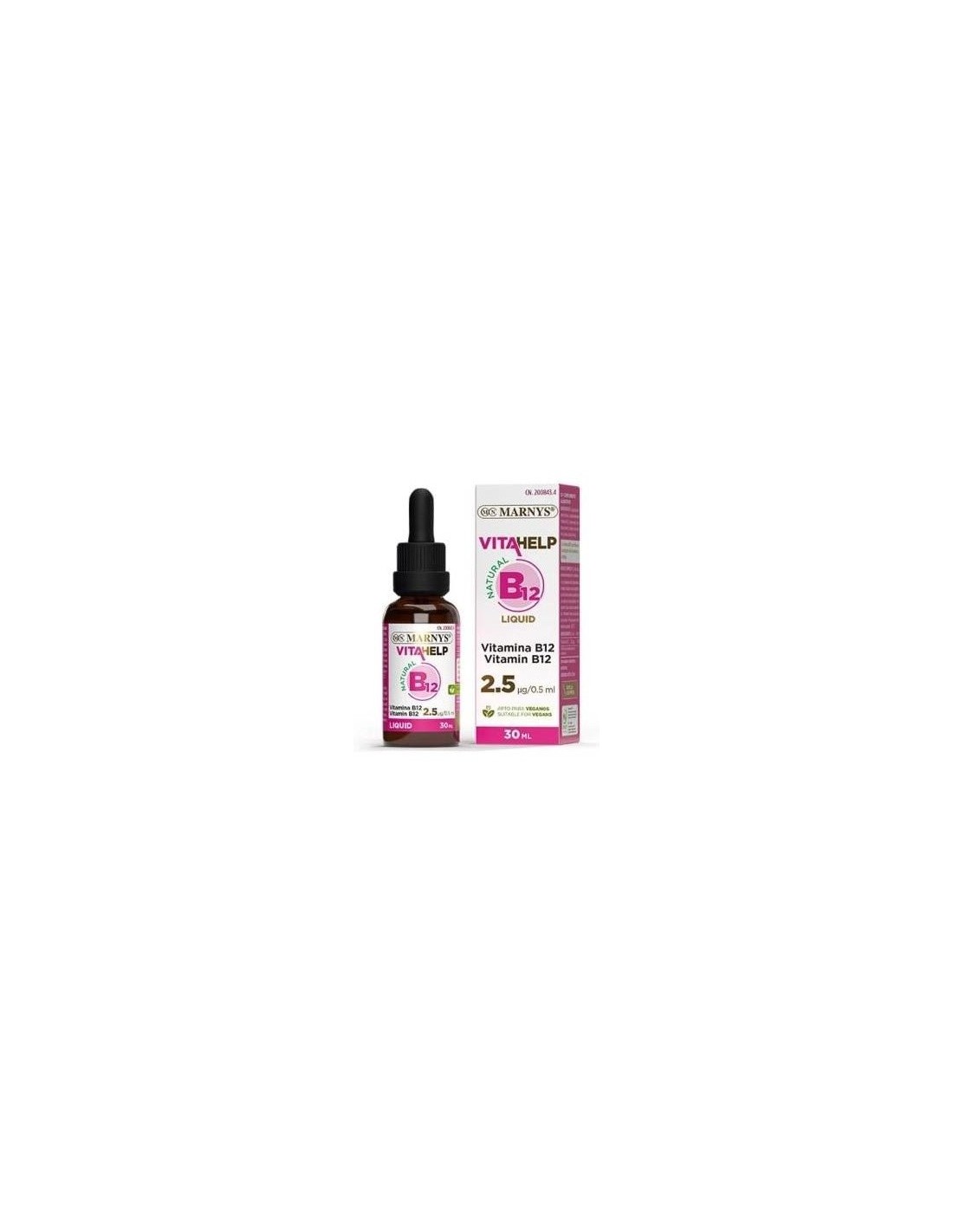 Este producto es un complemento alimenticio de agradable sabor frutal cuya fórmula en una base de glicerina vegetal permite su administración vía sublingual. La Vitamina B12, implicada en la división celular, contribuye a mantener la función normal del sistema inmune; contribuye a disminuir la fatiga y cansancio y a la formación normal de los glóbulos rojos; la función normal del sistema nervioso, el metabolismo energético normal, el metabolismo normal de la homocisteina y a mantener las funciones fisiológicas normales. Composición por 0,5 ml:2,5 mcg de vitamina B12 (cianocobalamina).Ingredientes:Agua desionizada, fructosa, Vitamina B12 (cianocobalamina), sorbato potásico, aroma y ácido cítrico. Modo de empleo: