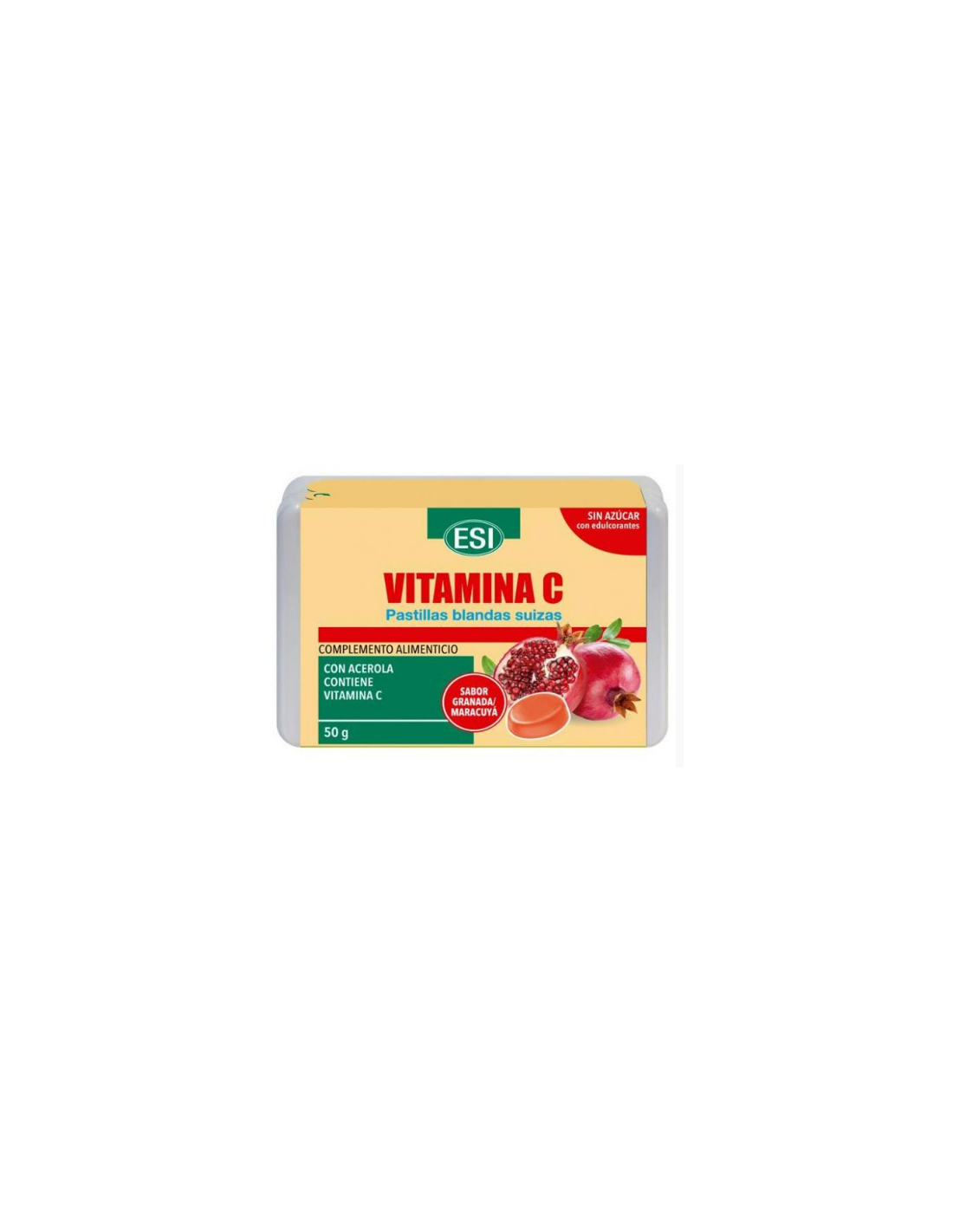 Producto a base de vitamina C con acerola (vitamina C de origen natural) en formato pastilla blanda que ayuda a cubrir las necesidades diarias de vitamina C. Apta para adultos y niños mayores de 6 años. Contiene estevia como edulcorante. Sabor granada y maracuyá. Apto para veganos.