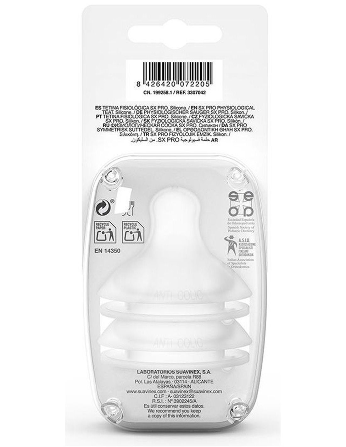 SUAVINEXCreada teniendo en cuenta las particularidades bucodentales del bebé, cuyo maxilar y mandíbula están en pleno desarrollo. Cumpliendo con las recomendaciones profesionales más avanzadas para no interferir en el desarrollo de la cavidad oral. Avalada por la Sociedad Española de Odontopediatría. Silicona fina ultra-suave con acabado arenado, imita en textura y consistencia el pezón materno, consiguiendo: Máxima calidez, un movimiento super flexible, la adaptación máxima a la forma del paladar. Flujo denso (a partir de 6 meses).