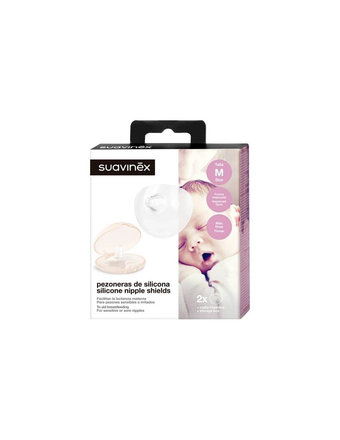 SUAVINEXLas pezoneras de silicona ayudan a continuar con la lactancia materna a pesar de sufrir molestias o irritaciones en el pezón. Pueden utilizarse en aquellos casos en los que las madres tienen los pezones planos, retraídos o invertidos, ya que se acoplan perfectamente al seno facilitando el agarre y la succión del recién nacido. Tacto muy suave. Incluye cajita higiénica de polipropileno para guardar recién esterilizadas o transportar.