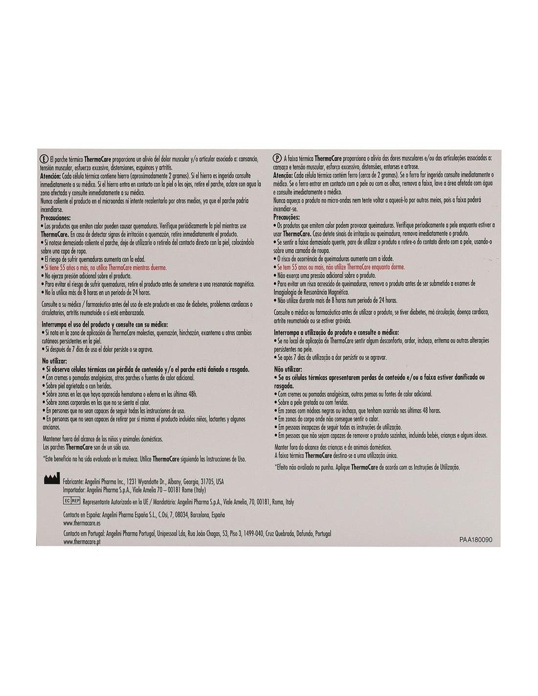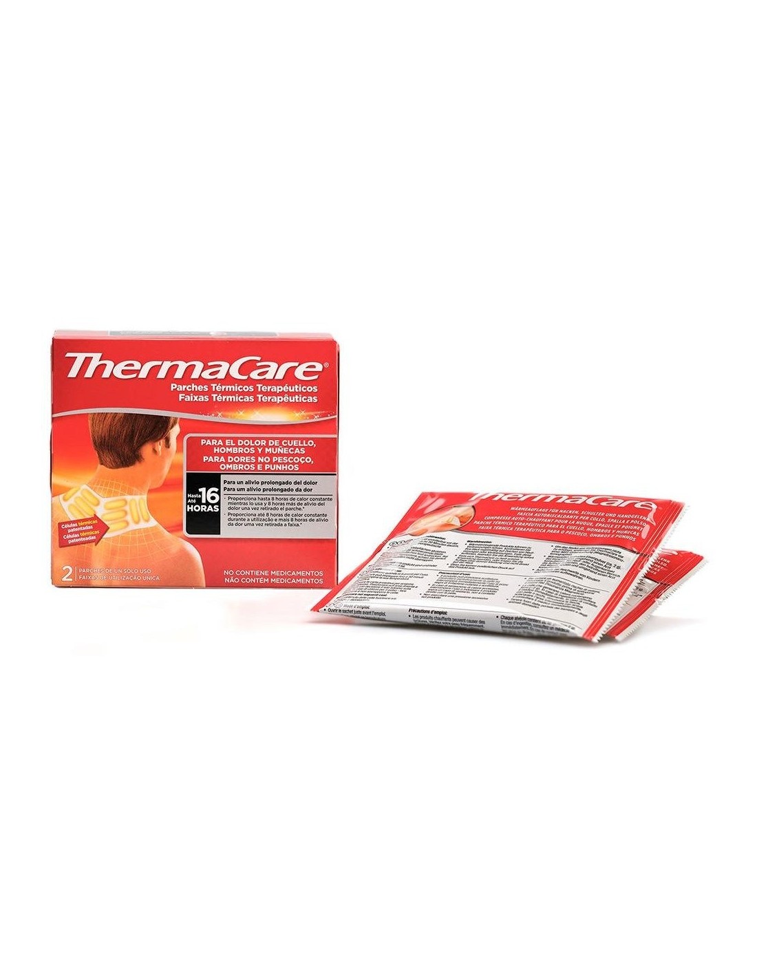 THERMACAREThermaCare® cuello, hombros y muñecas está indicado para tratar el dolor muscular y articular inespecífico en las zonas del cuello, los hombros y las muñecas. Los parches están constituidos por 10 células de calor patentadas y tienen una forma ergonómica para adherirse perfectamente a la piel a través de dos zonas adhesivas. Proporciona alivio prolongaodo durante 16 horas. Esto es, 8 horas mientras se lleva puesto y 8 horas adicionales después de quitárselo.