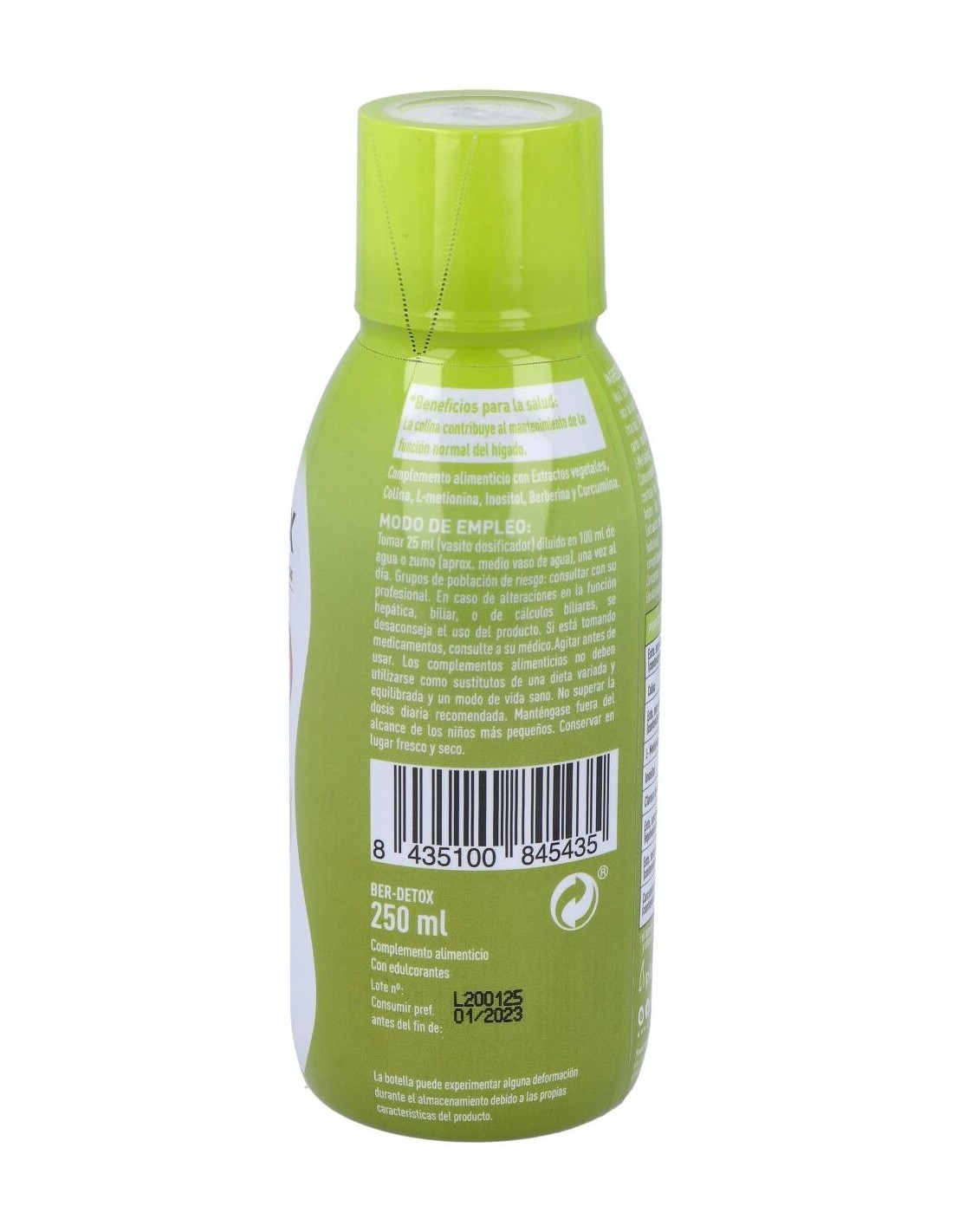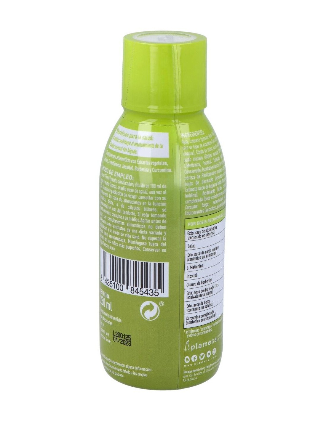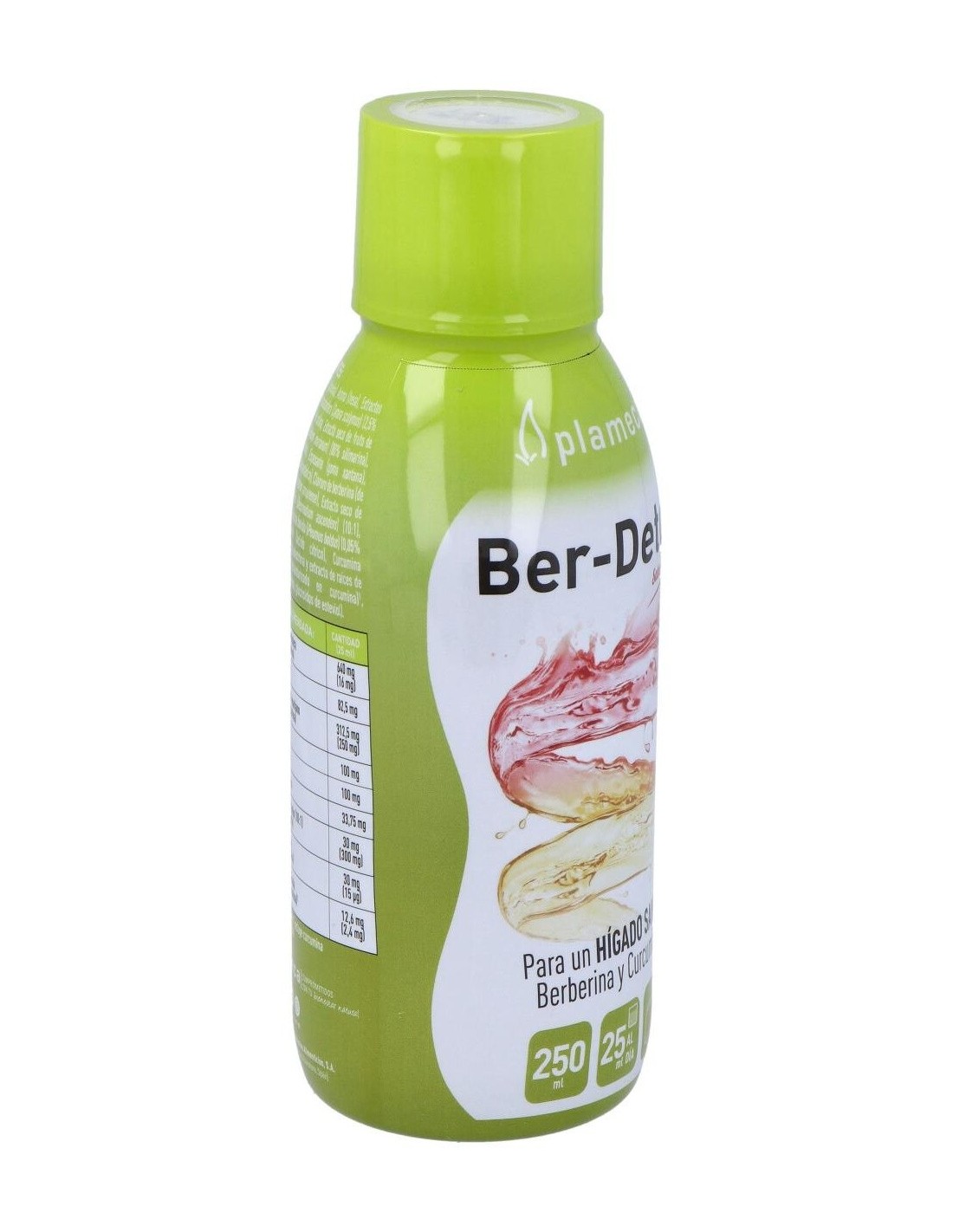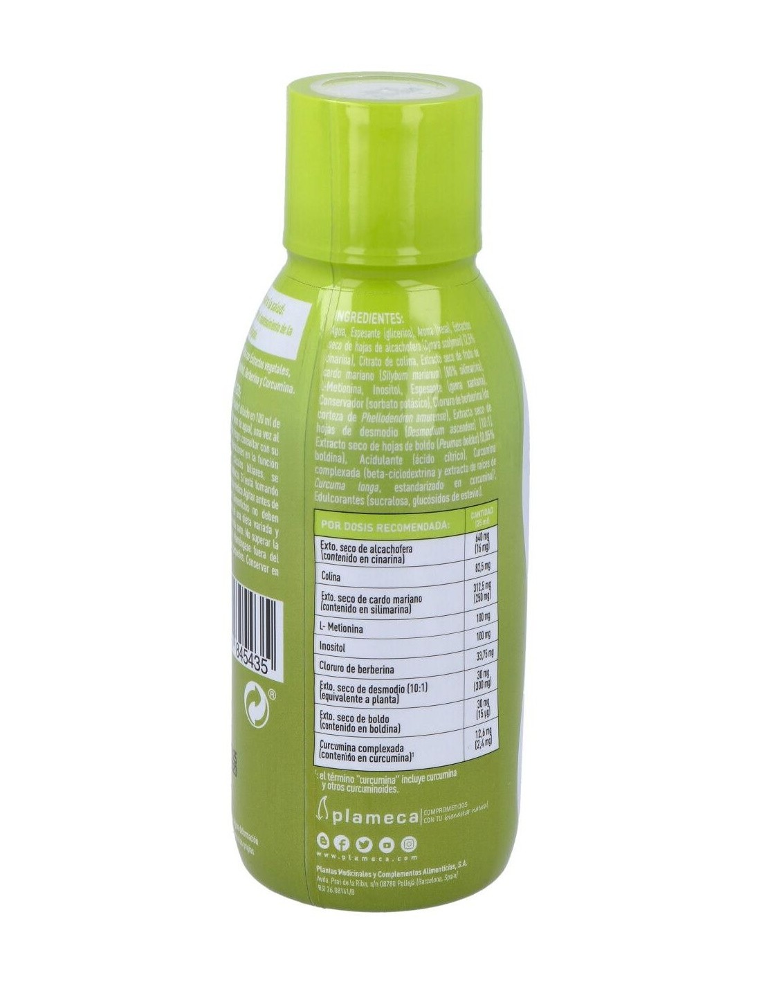 Ingredientes:Agua, Espesante (glicerina), Aroma (fresa), Extractos seco de hojas de alcachofera (Cynara scolymus) (2,5% cinarina), Citrato de colina, Extracto seco de fruto de cardo mariano (Silybum marianum) (80% silimarina), L-Metionina, Inositol, Espesante (goma xantana), Conservador (sorbato potásico), Cloruro de berberina (de corteza de Phellodendron amurense), Extracto seco de hojas de desmodio (Desmodium ascendens) (10:1), Extracto seco de hojas de boldo (Peumus boldus) (0,05% boldina), Acidulante (ácido cítrico), Curcumina complexada (beta-ciclodextrina y extracto de raíces de Curcuma longa, estandarizado en curcumina*), Edulcorantes (sucralosa, glucósidos de esteviol).Modo de empleo:Tomar 25 ml directamente o diluido en un vaso de agua o zumo, una vez al día.Presentación:Frasco de 250 ml.