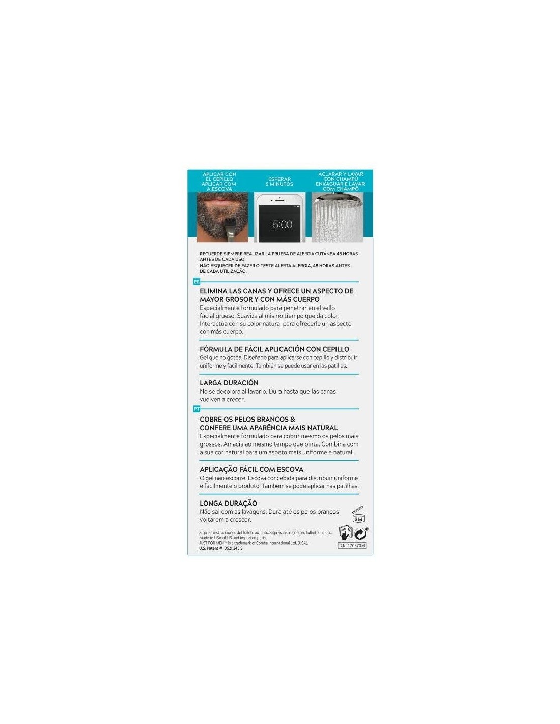 JUST FOR MENElimina las canas para lograr un aspecto de mayor grosor y con más cuerpo. Suaviza al mismo tiempo que da color. Coloración con cepillo de fácil aplicación. Fórmula más cremosa. Aplicación más fácil. Con biotina, aloe y aceite de coco. Resultados en 5 minutos. Dura hasta que las canas vuelven a crecer.
