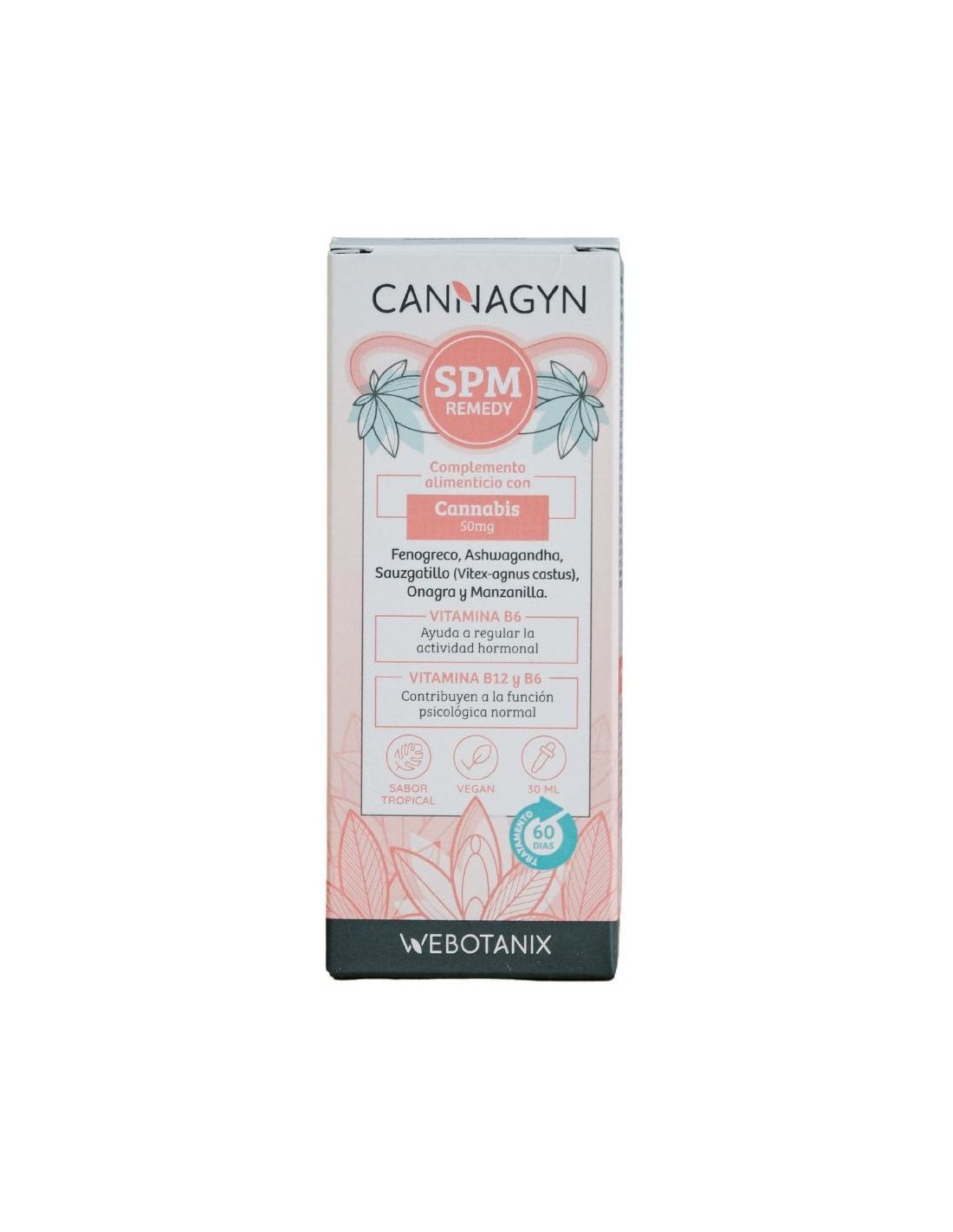 Cannagyn SPM Remedy de WeBotanix es un complemento alimenticio especialmente diseñado para el alivio del síndrome premenstrual. Está formulado por una mezcla de extractos de plantas y vitaminas que favorecen la regulación hormonal del cuerpo femenino y disminuyen la inflamación.Propiedades: