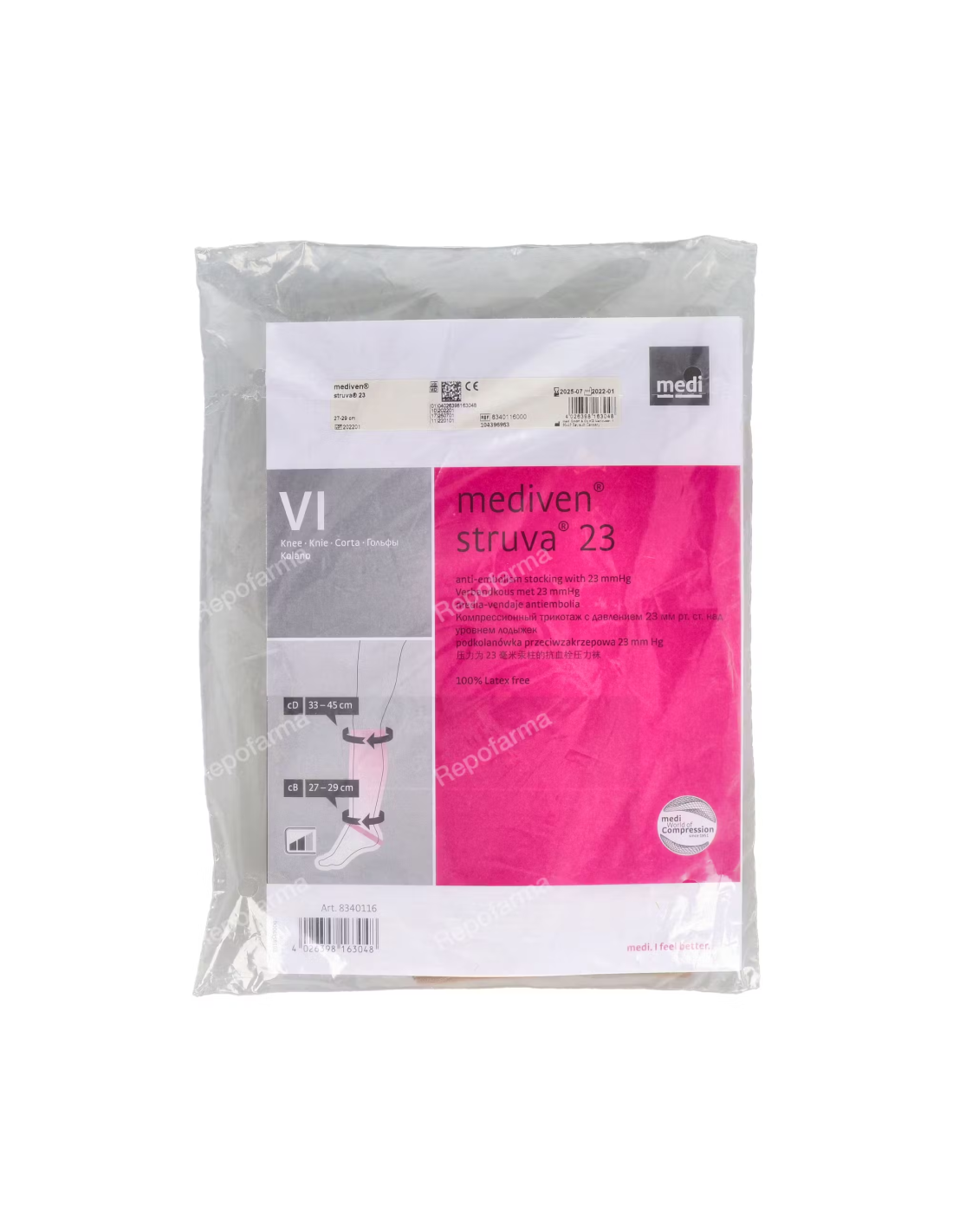 MEDIVENLas medias de vendaje tienen un campo de aplicación muy amplio para el tratamiento ambulatorio o en régimen de ingreso parcial de las trombosis en cirugía venosa y, en general, cuando se necesitan vendajes compresivos de las extremidades inferiores. Con una presión de 23 mmHg en el empeine, que va disminuyendo uniformemente hacia el muslo, mediven struva 23 es especialmente adecuada para la compresión breve directa posquirúrgica tras una intervención en las venas. Favorece el retorno venoso y evita la aparición de edemas y derrames sanguíneos.