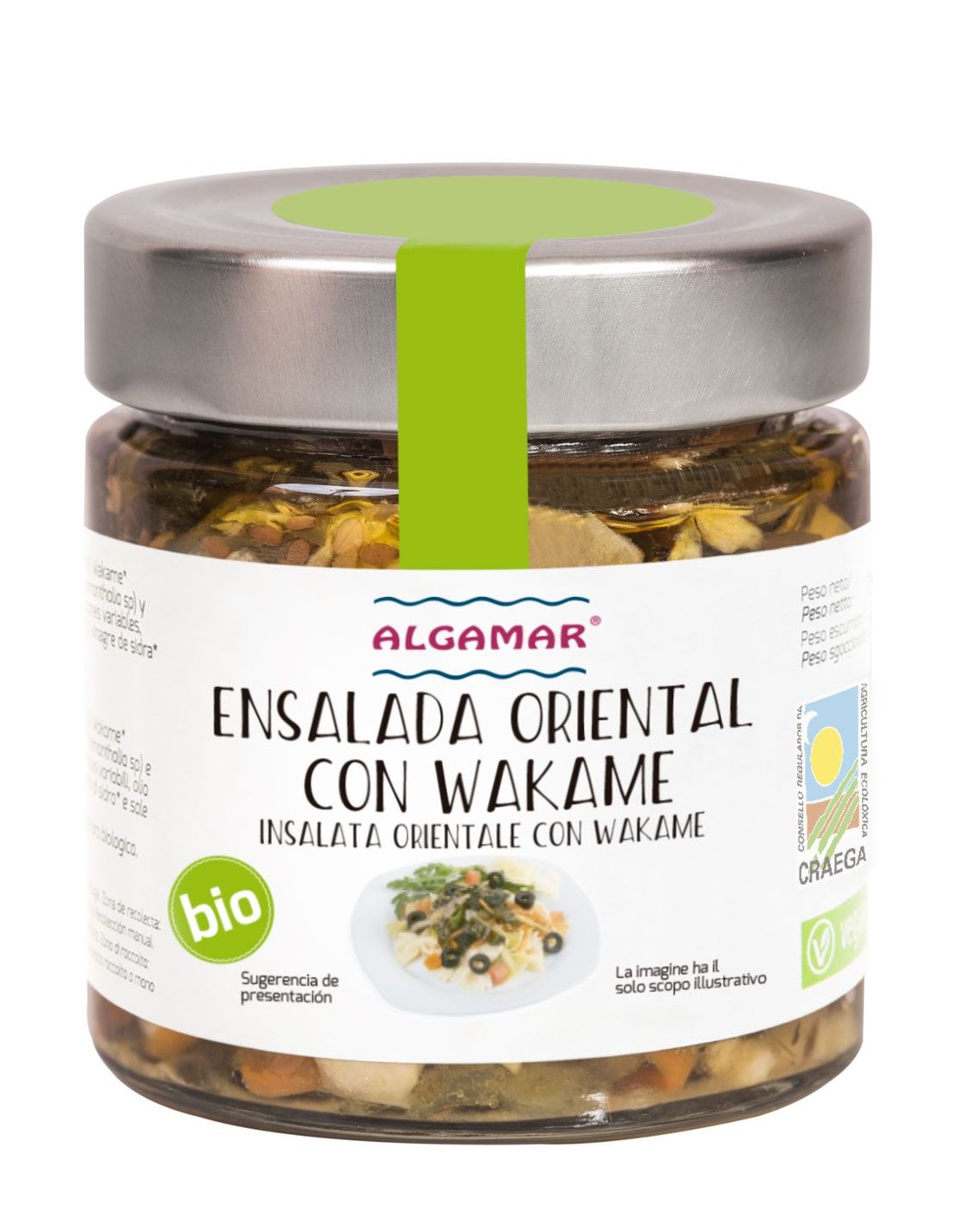 Ingredientes:Alga Wakame* (Undaria sp) (36,7%), aceite de sésamo*, col*, zanahoria*, seta shiitake*, vinagre de arroz*, salsa de soja*, agave*, sésamo