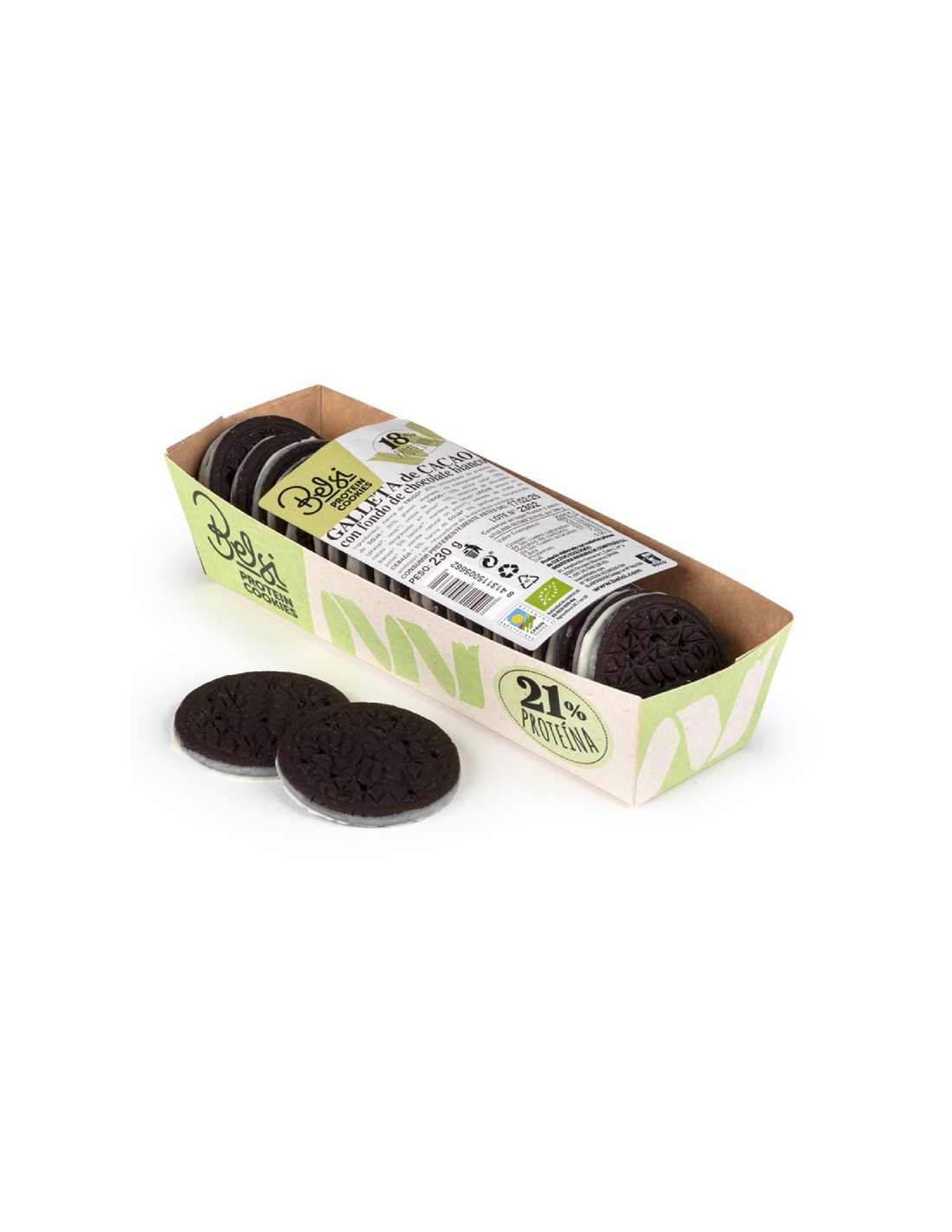 Galleta de cacao con fondo chocolate blanco proteica eco de Belsi