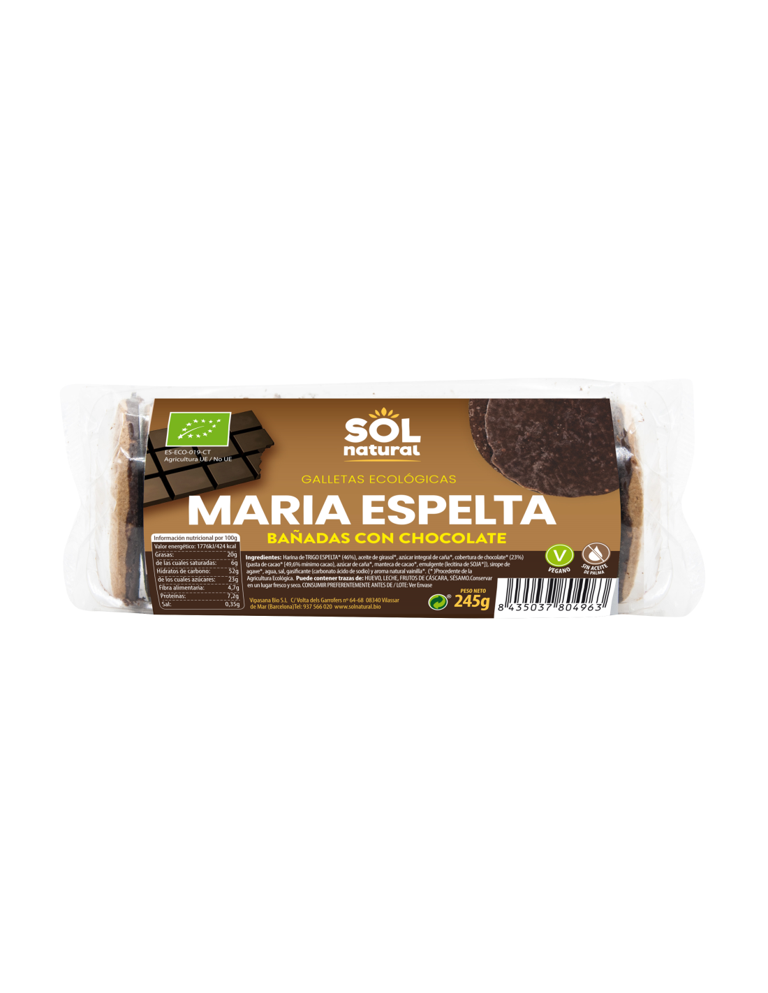 SOLNATURALCaracterísticas y Beneficios del Pack 12 Uds. Marías Espelta Bañadas Con Chocolate Bio 245 g de Solnatural
