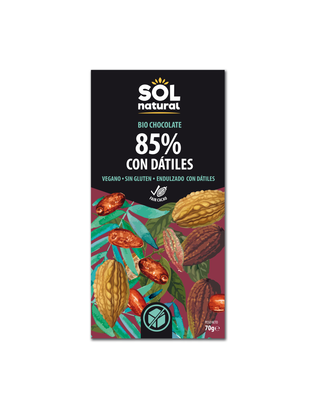 SOLNATURALCaracterísticas y Beneficios del Pack 10 Uds. Tableta Chocolate Dark 85% Con Dátiles Bio 70 g de Solnatural