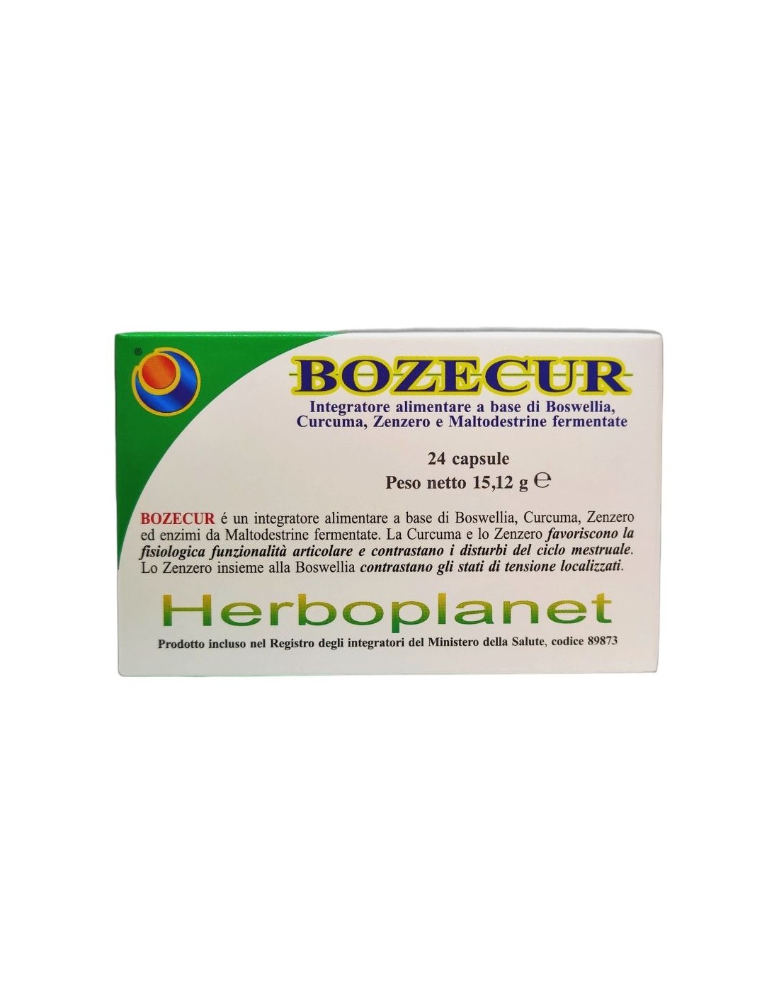 Bozecur de Herboplanet es un complemento alimenticio diseñado para apoyar la función articular y aliviar las molestias menstruales. Contiene extracto de resina de Boswellia, rizoma de Cúrcuma, rizoma de Jengibre y maltodextrinas fermentadas.Composición activa por 2 cápsulas: