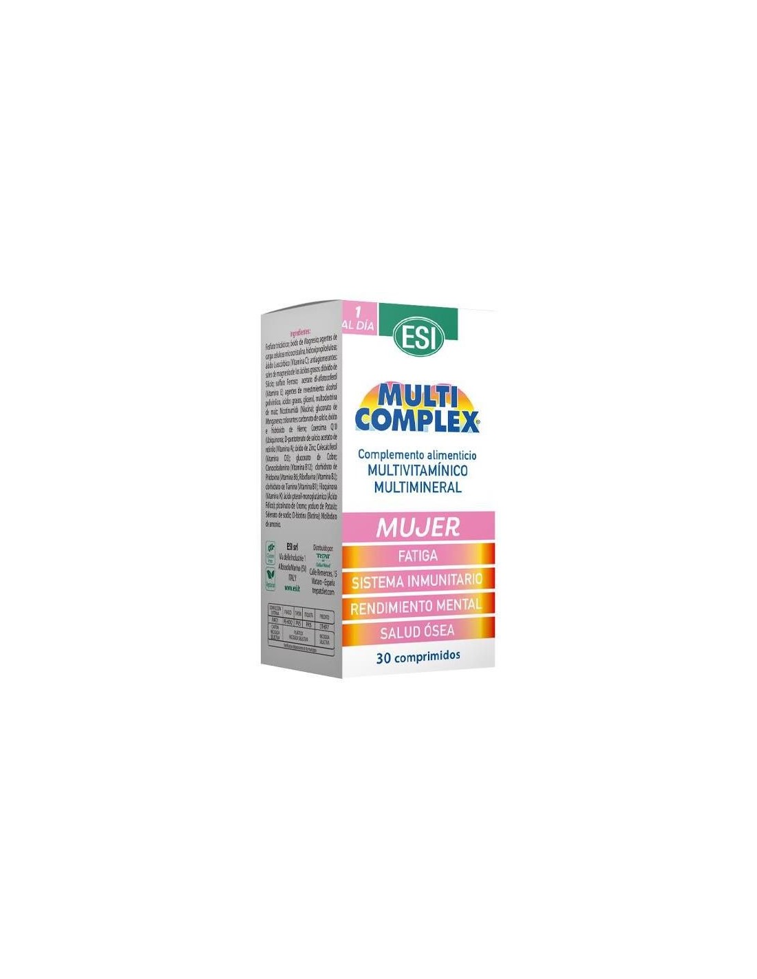 Multicomplex Mujer de ESI es un suplemento nutricional a base de vitaminas y minerales especialmente formulado para la mujer hasta los 50 años con el objetivo de prevenir estados carenciales o mantener un buen estado de salud en caso de que sus necesidades estén aumentadas.Multicomplex mujer está indicado para evitar el cansancio físico, garantizar el correcto funcionamiento del sistema inmunitario, favorecer las funciones intelectuales y la salud ósea. Fórmula equilibrada.Composición activa por comprimido: