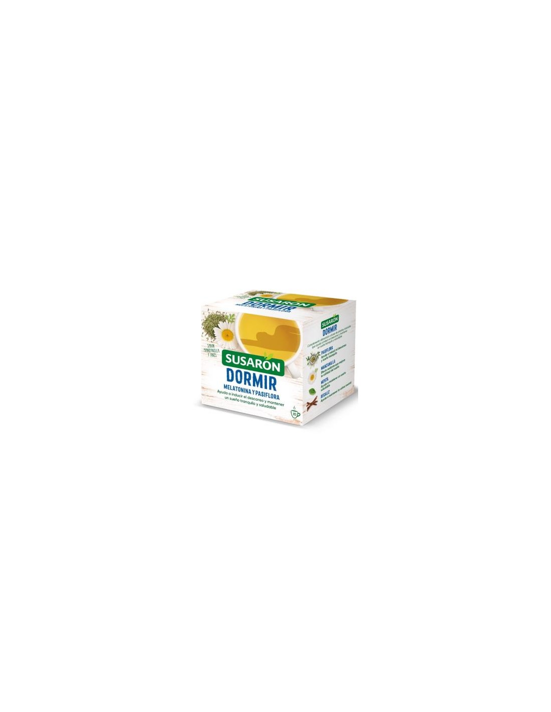 SUSARONInfusión que combina melatonina, pasiflora, manzanilla y menta. La pasiflora y manzanilla tienen propiedades relajantes asociadas tradicionalmente. La meltanonina contribuye a reducir el tiempo necesario para conciliar el sueño. Con sabor a manzanilla y anís.