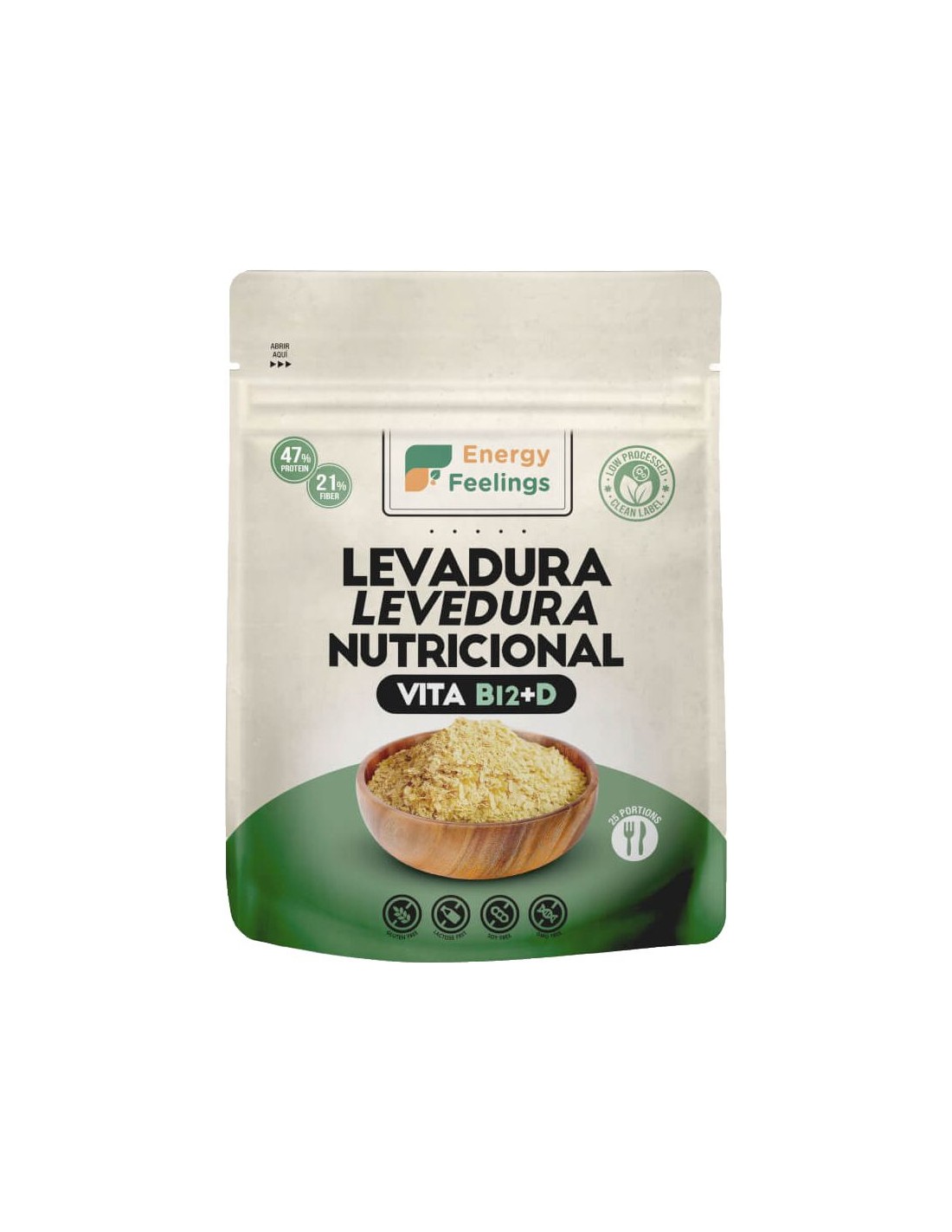 La levadura nutricional en copos con vitamina B y D de Energy Feelings es un súper alimento que enriquece el valor nutritivo de cualquier preparación. Al ser inactiva no provoca el desarrollo de levaduras en el intestino.Con 47% de proteínas biodisponibles es extraordinariamente rica en todas las vitaminas del grupo B. Con la ingesta de tan solo 10 g se superan sobradamente los valores diarios de referencia de las vitaminas B1, B2, B3, B5, B6, B9 y la preciada B12. También aporta 1400 UI de Vitamina D (la dosis recomendada diaria para un adulto es de 600 UI). Especialmente pensada para dietas de personas veganas.Es un producto concebido para la alimentación humana (a diferencia de la más comúnmente comercializada levadura de cerveza), sin los residuos potencialmente tóxicos de la industria cervecera.La levadura nutricional en copos con vitamina B y D de Energy Feelings tiene un delicioso sabor ligeramente salado, no amargante (a diferencia de la levadura de cerveza tradicional). Se presenta en forma de escamas de un color pardo claro.Es también una gran fuente de Zinc (247 mg en 100g de producto), conteniendo además calcio, magnesio, hierro y cobre.La levadura nutricional es fuente de fibras dietéticas naturales con un bajo contenido de grasa.Propiedades: