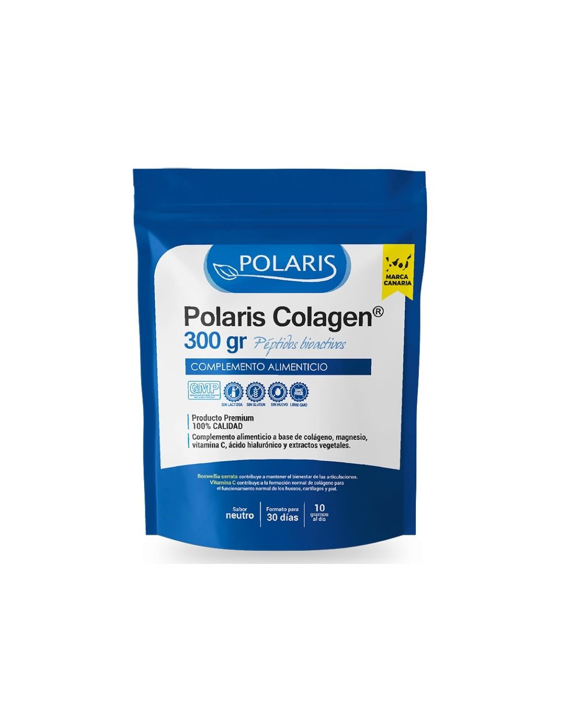 Ingredientes:Colágeno hidrolizado, Carbonato de magnesio, Vitamina C (ácido L-ascórbico), Extracto seco de Cúrcuma longa raíz (95% curcuminoides totales), Ácido hialurónico (como salsódica), Extracto seco de Boswellia serrata resina (65% ácidoboswélico) y Antiaglomerante (dióxido de silicio).Modo de empleo:Tomar 10 g (aprox. el contenido de un cazo dosificador raso) al día disuelto en un vaso de agua o zumo de frutas, se recomienda verter primero el producto, añadir seguidamente el líquido, preferiblemente no frío y remover.Presentación:Envase de 300 gramos sabor neutro.Recomendaciones y advertencias:No contiene lactosa, gluten ni huevo.